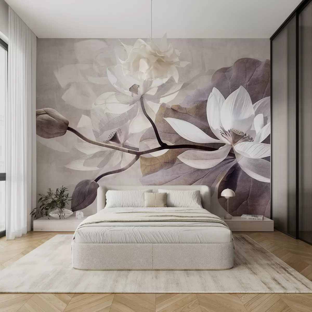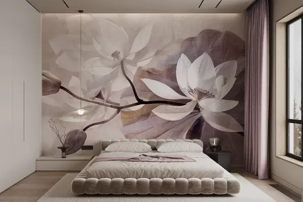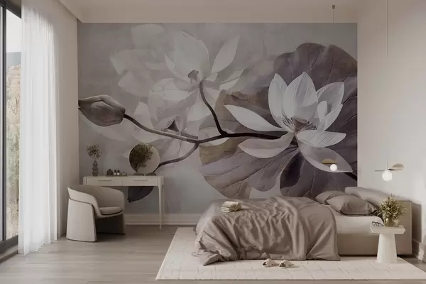 Fototapetes Graudainas faktūras, piesātināti, maigi smalki lotosa ziedi ar lapām un stublājiem maigā, bēšā krāsu paletē Nr. w09159