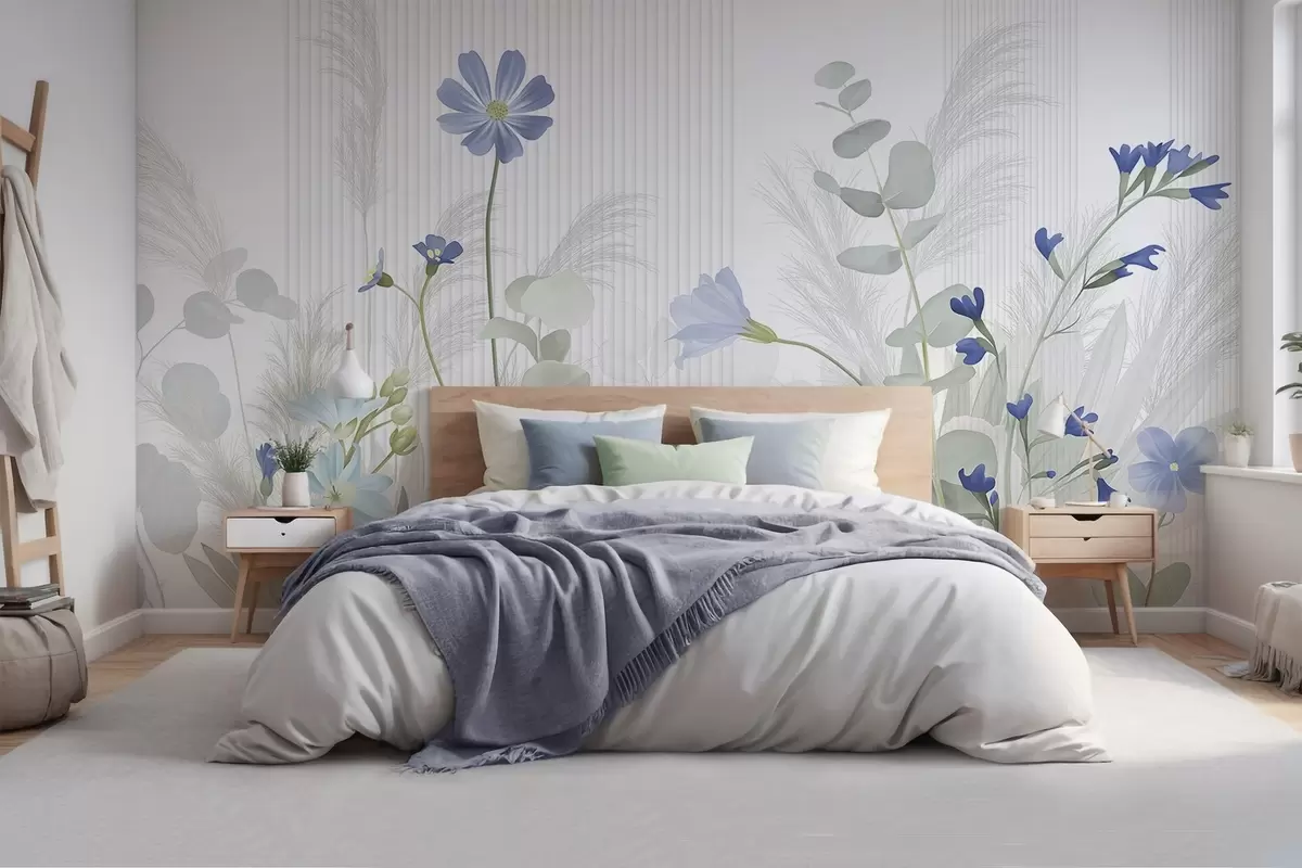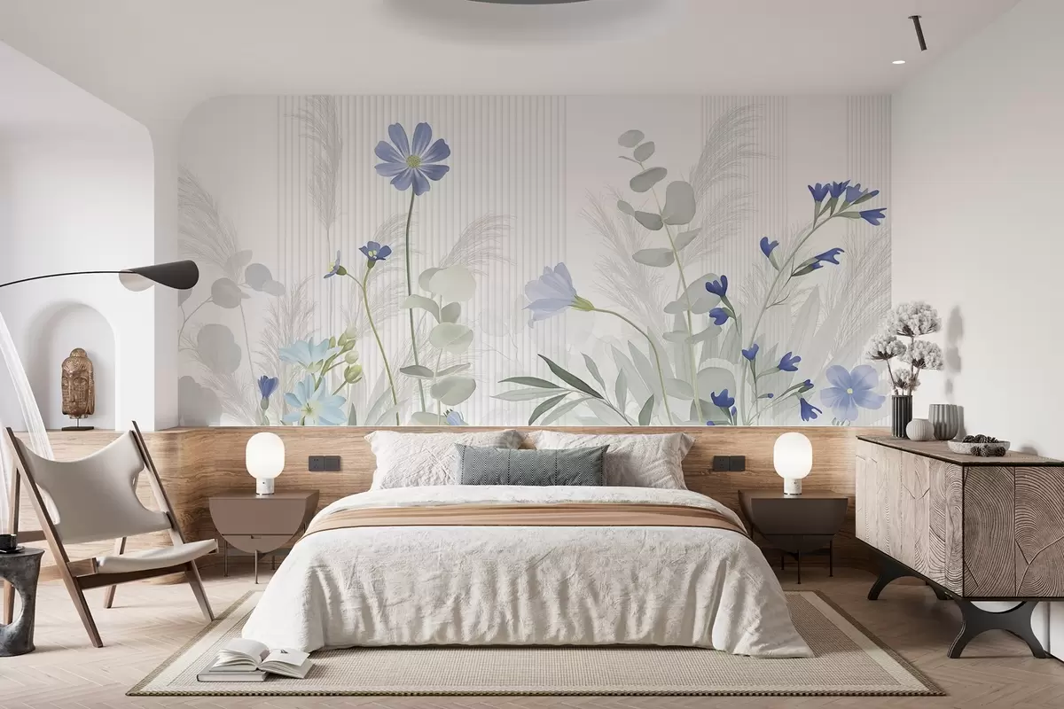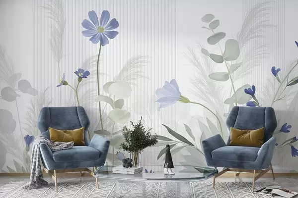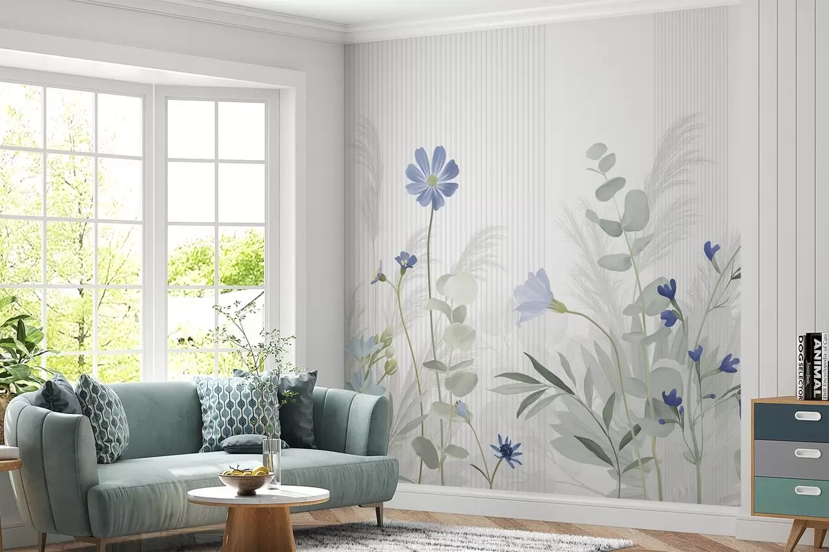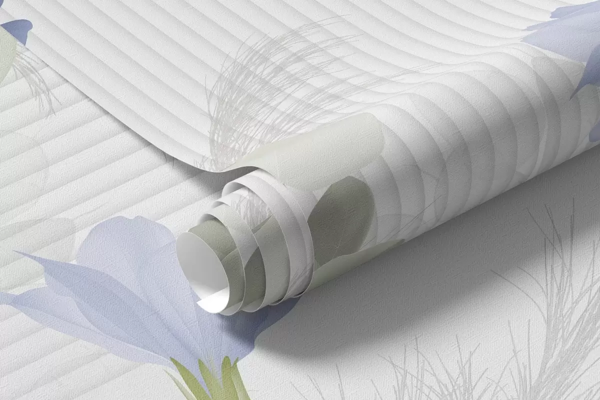 Fototapetes Ziedi pasteļtoņos, gaiši zaļas lapas, balts fons ar vertikālām līnijām, elegants un minimālisms Nr. w09161v1