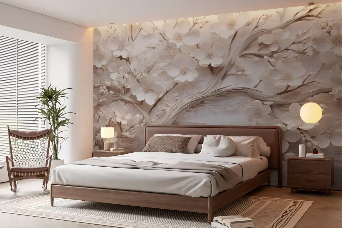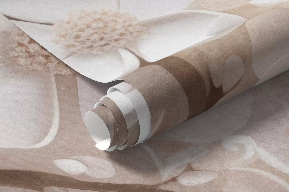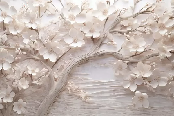 Fototapetes Teksturēts koks ar baltiem ziediem un brūnu stumbru, fons ir balts ar horizontālām līnijām, mīksts apgaismojums Nr. w09166