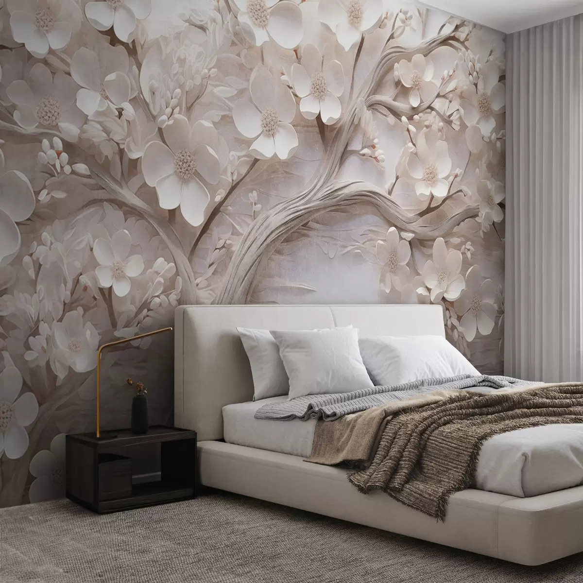 Fototapetes Teksturēts koks ar baltiem ziediem un brūnu stumbru, fons ir balts ar horizontālām līnijām, mīksts apgaismojums Nr. w09166