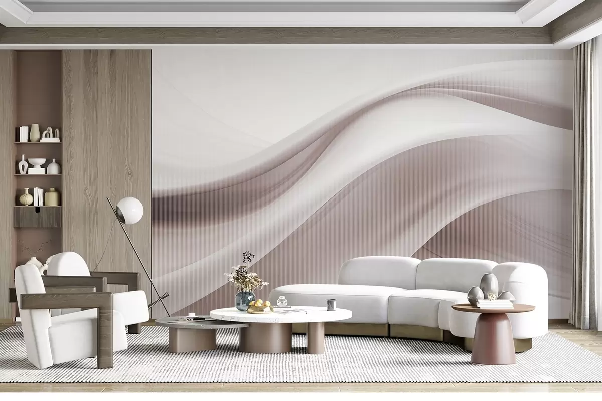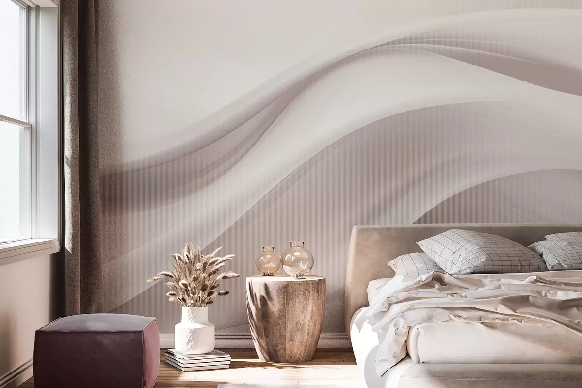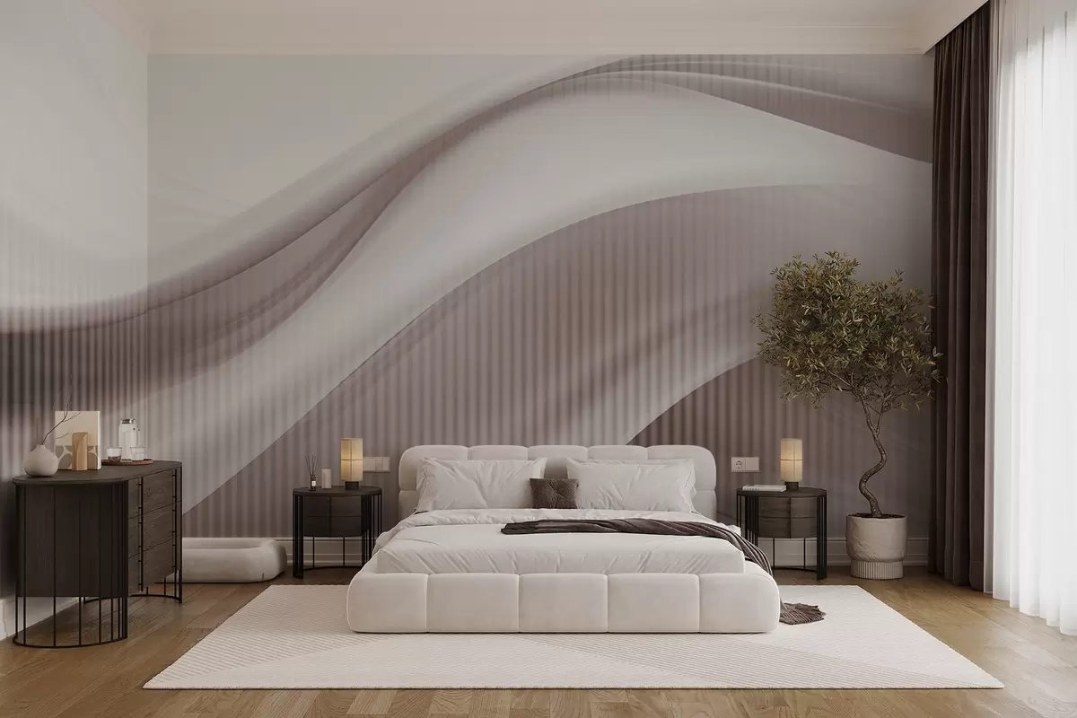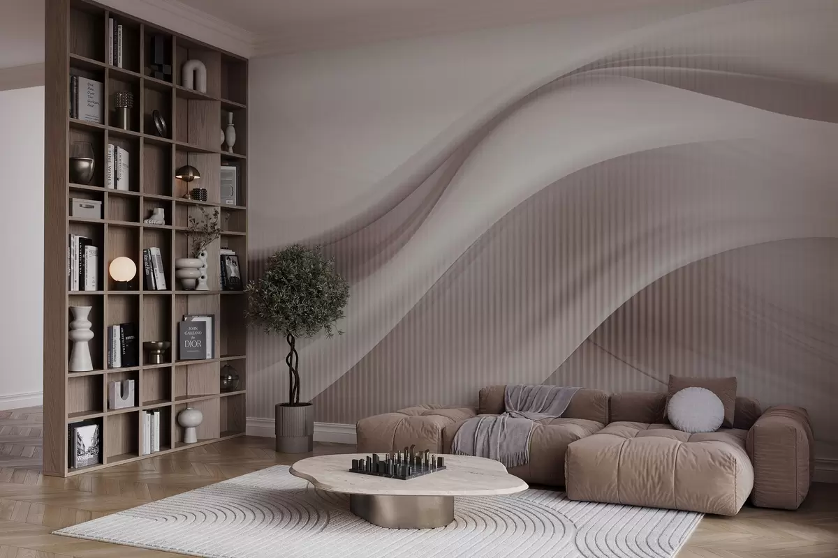 Fototapetes Abstraktā apdruka ar plūstošām līnijām un smalki vertikālām svītrām, kas rada kustības un dziļuma sajūtu, smilškrāsas palete Nr. w09189