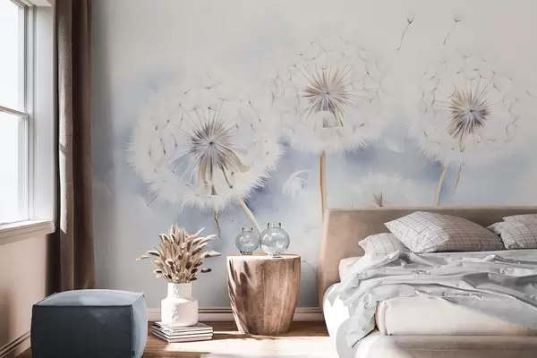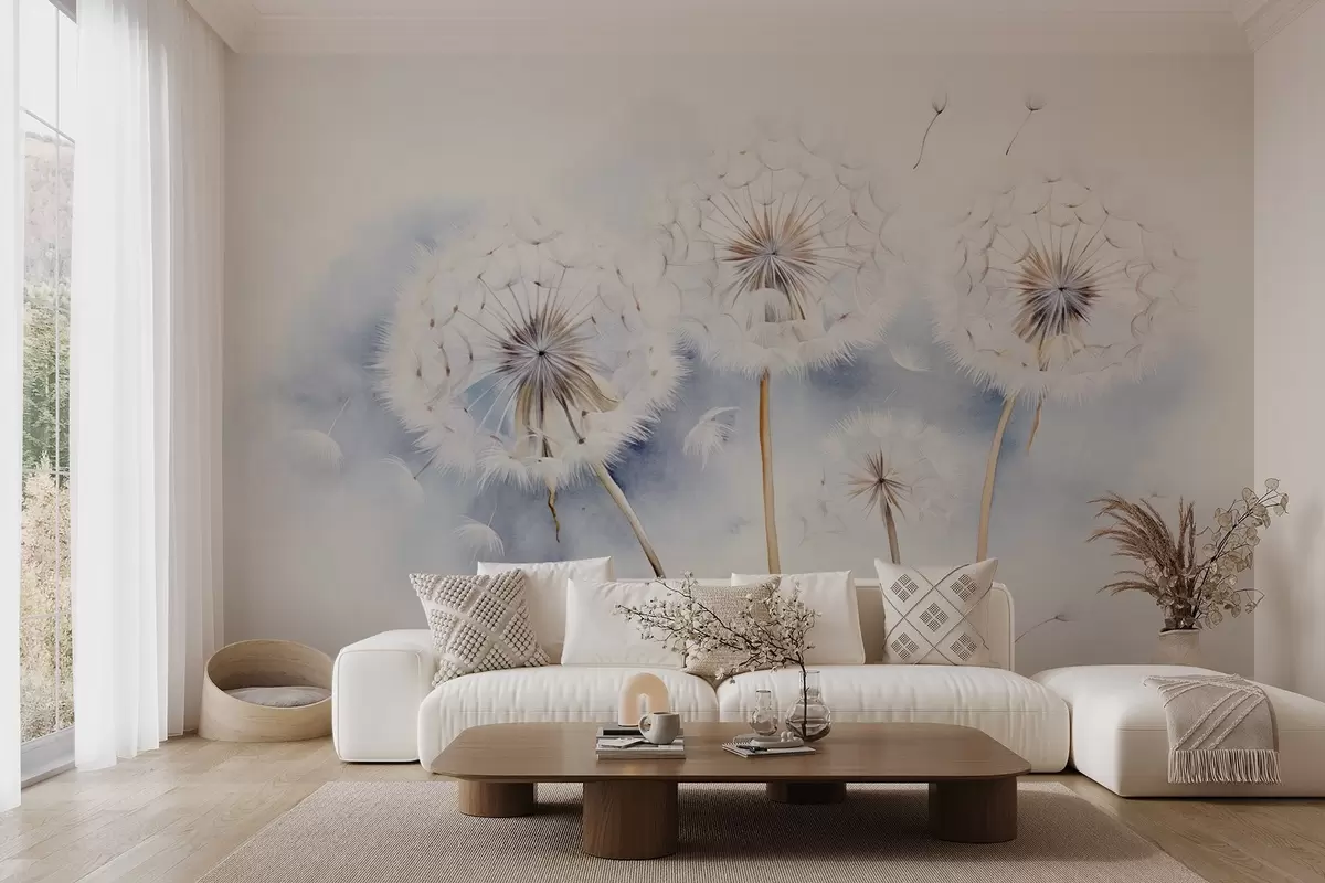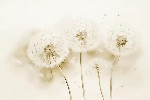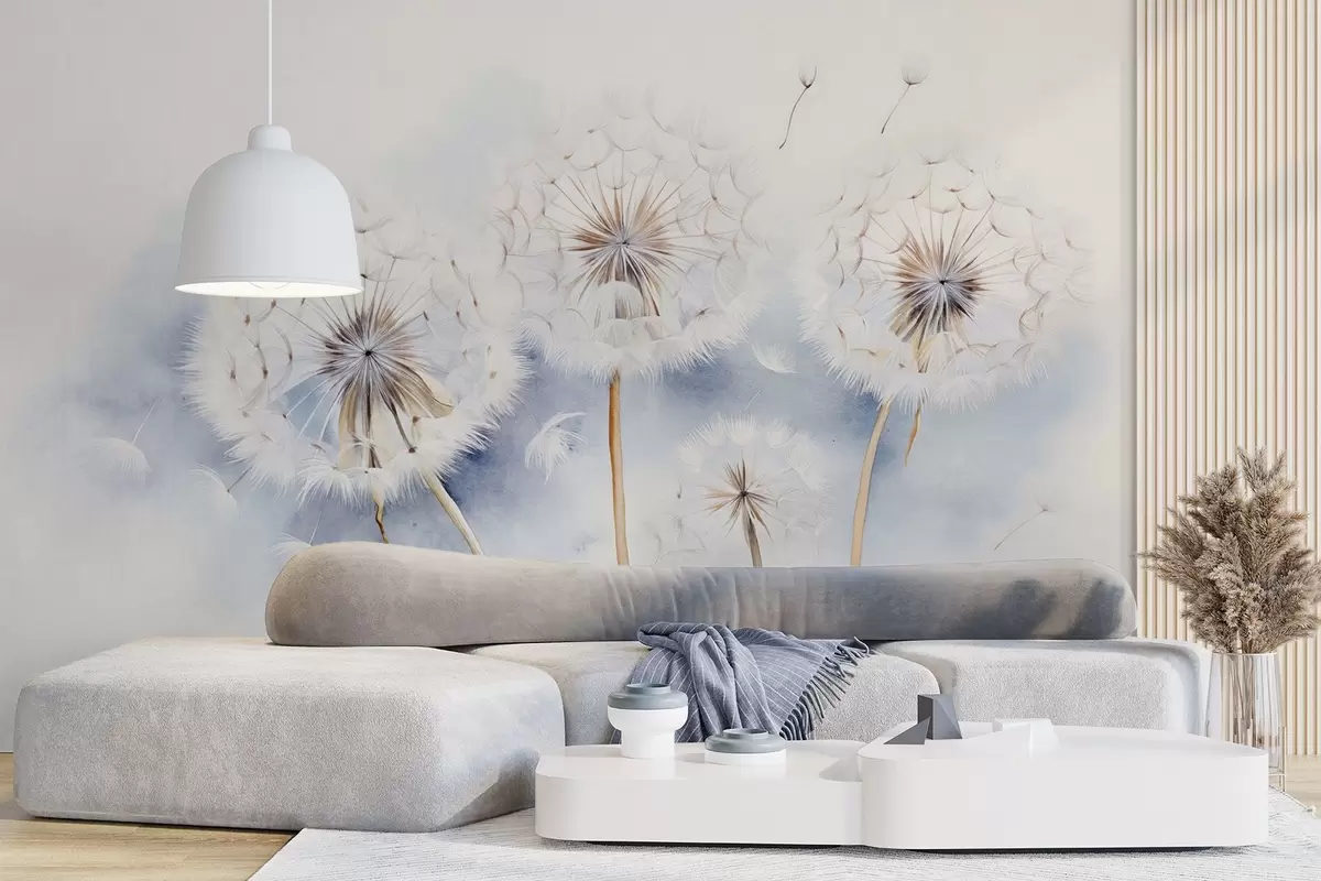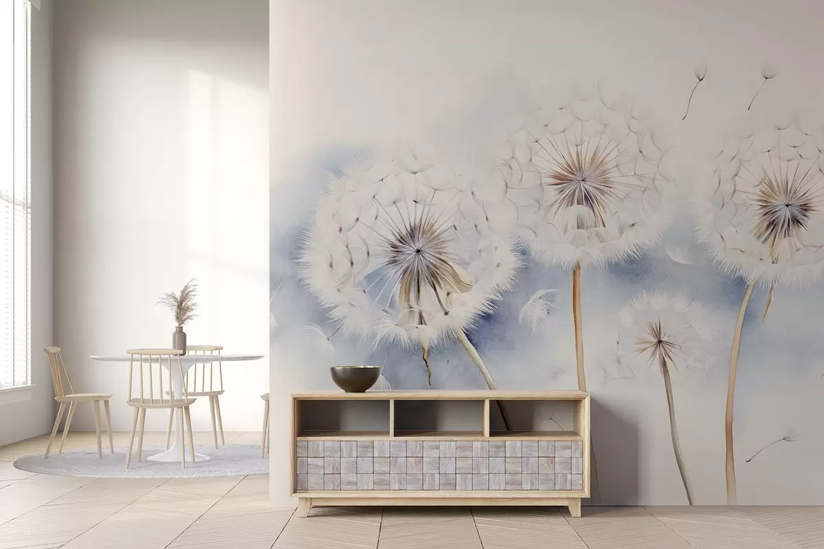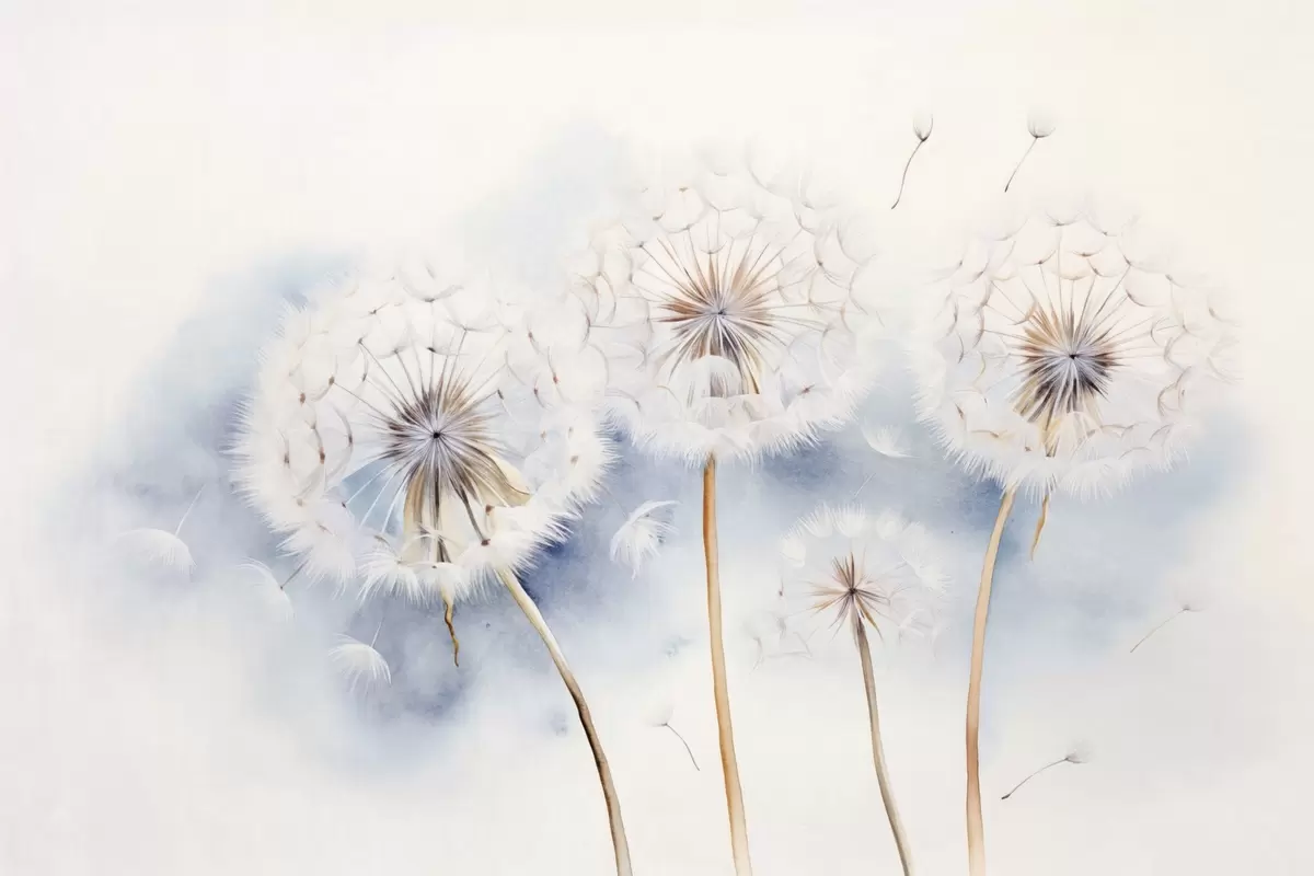 Fototapetes Teksturētas pienenes ar gaisā peldošām sēklām, gaiši zils un balts fons, maigs, smalks zīmēšanas stils Nr. w09190