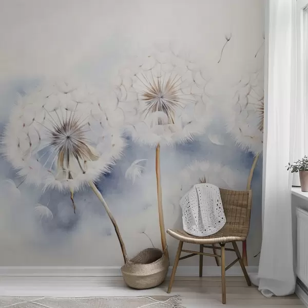 Fototapetes Teksturētas pienenes ar gaisā peldošām sēklām, gaiši zils un balts fons, maigs, smalks zīmēšanas stils Nr. w09190
