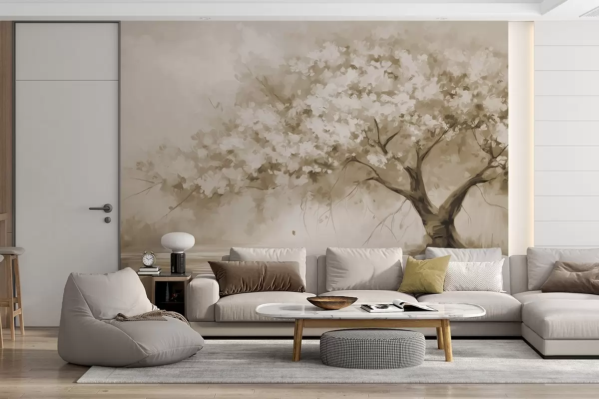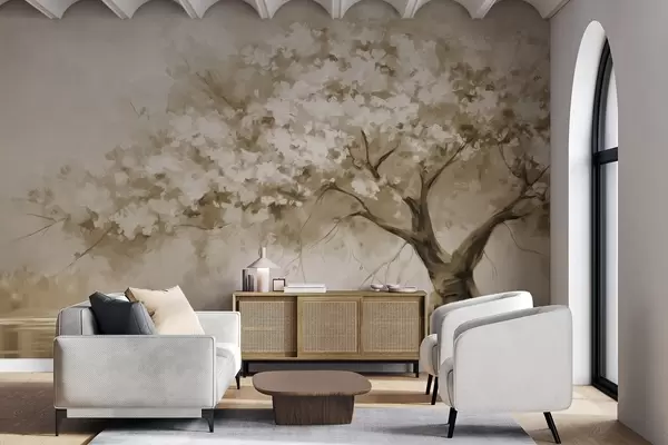 Fototapetes Abstrakts bēšs ziedu koks pilnā ziedēšanas laikā, blakus upei, mīksti fakturēti triepieni ar otu un pasteļtoņi Nr. w09193v1