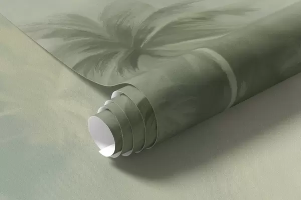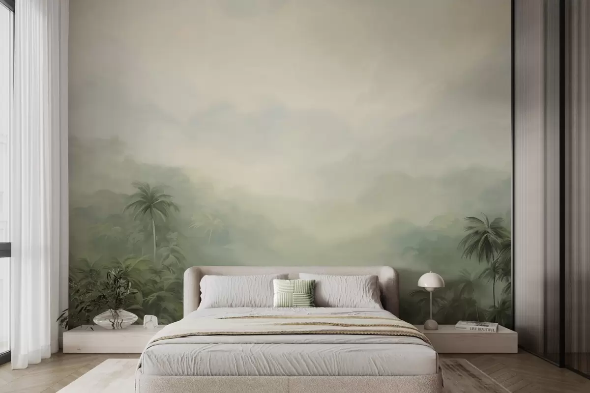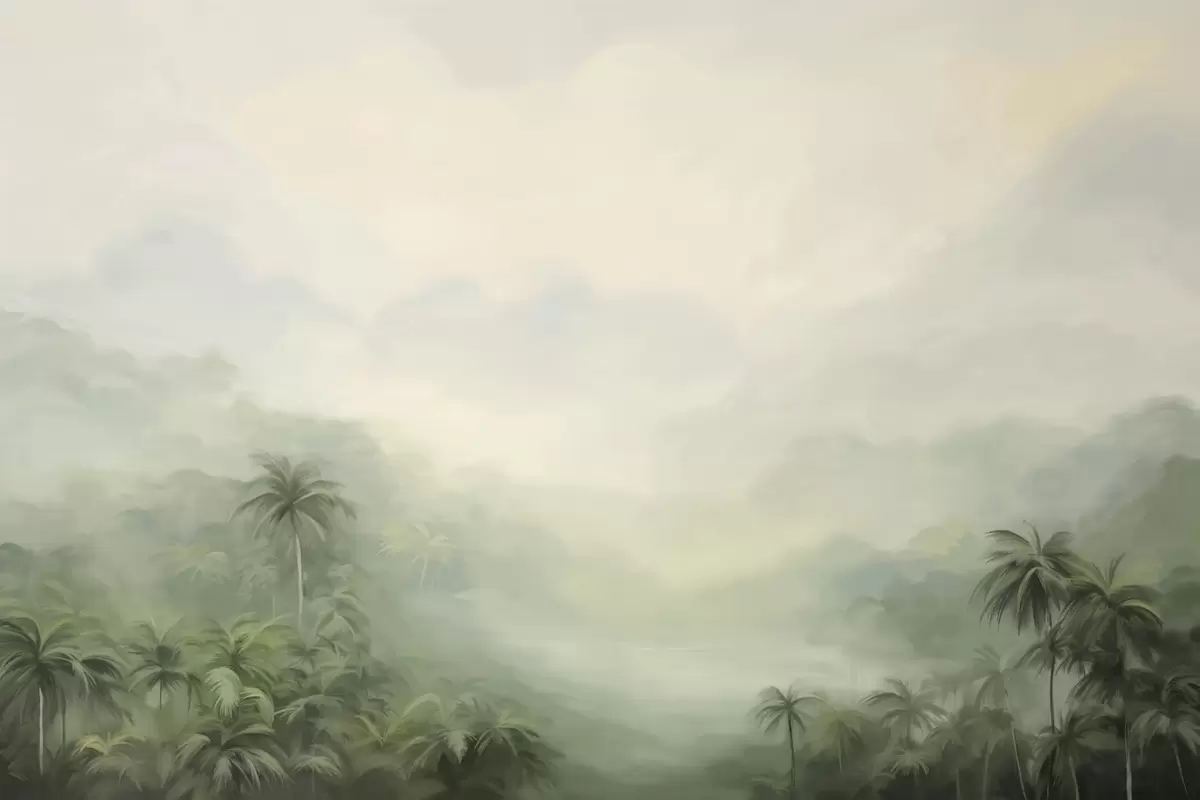 Fototapetes Gungle ainava ar sulīgi zaļām palmām un pauguriem, maigas pasteļkrāsas, teksturēta glezniecības imitācija Nr. w09194