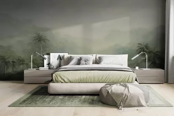 Fototapetes Gungle ainava ar sulīgi zaļām palmām un pauguriem, maigas pasteļkrāsas, teksturēta glezniecības imitācija Nr. w09194