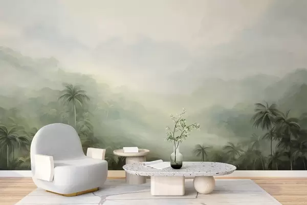 Fototapetes Gungle ainava ar sulīgi zaļām palmām un pauguriem, maigas pasteļkrāsas, teksturēta glezniecības imitācija Nr. w09194