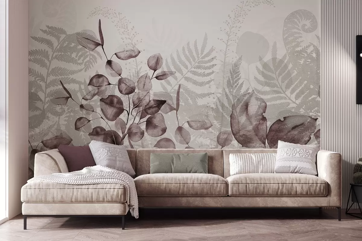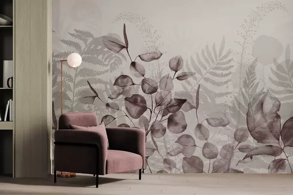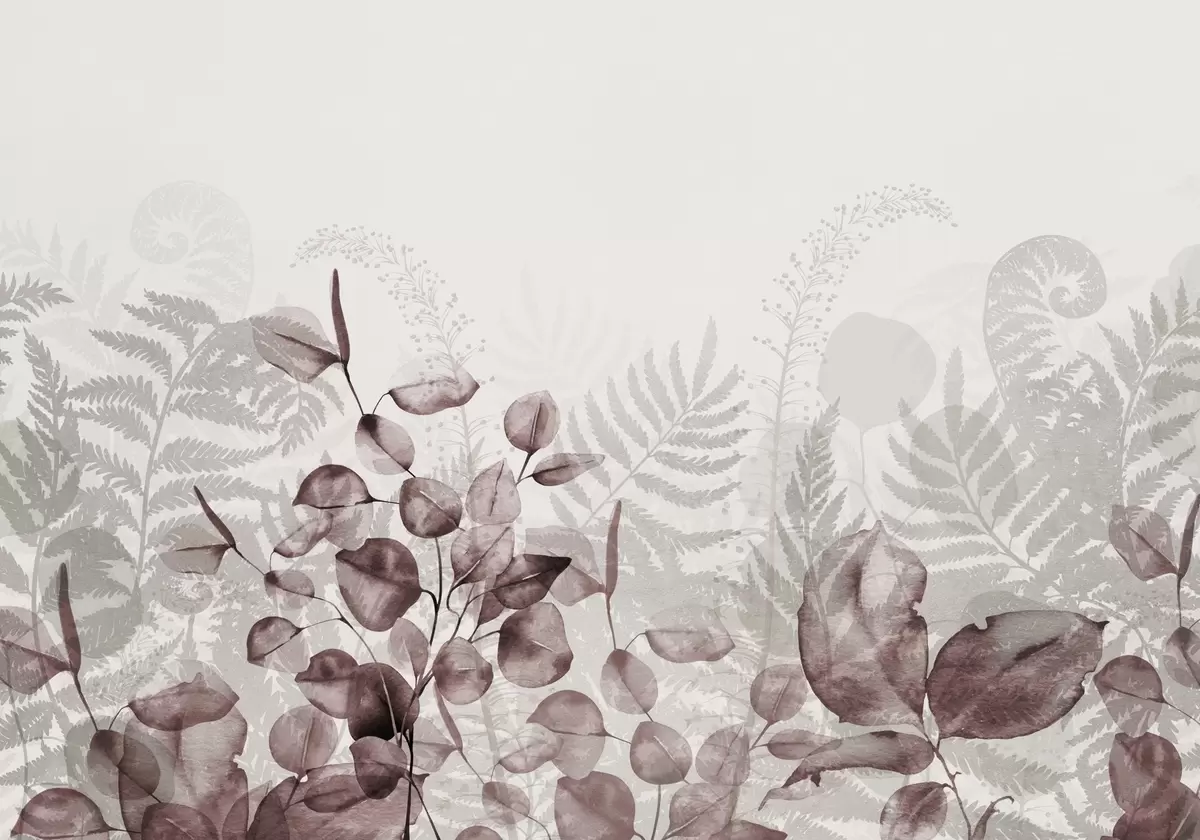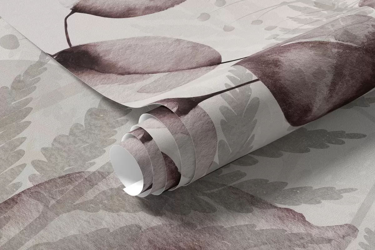 Fototapetes Eikalipta un papardes lapas bordo un pelēkos toņos, akvareļa efekts , botāniskā ilustrācija Nr. w09197v1