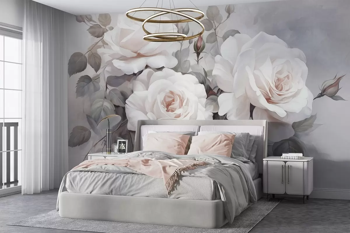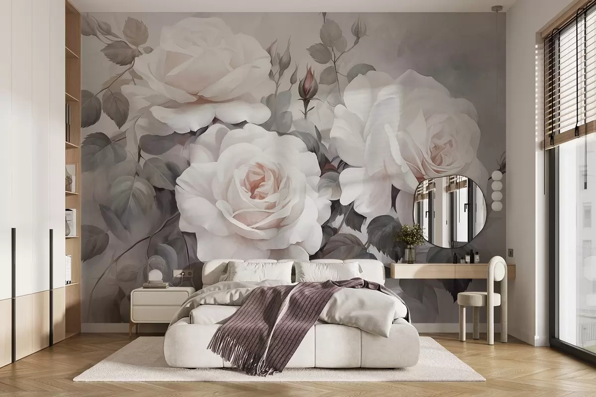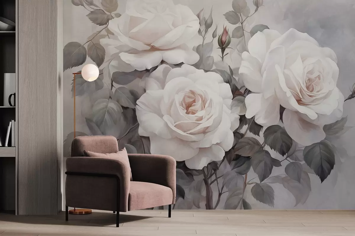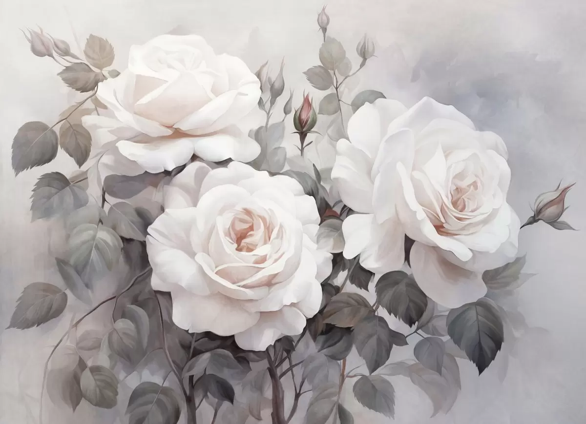 Fototapetes Teksturētas baltas rozes ar lapām un stublājiem, maigas, pieskaņotas pasteļtoņi, elegants vintage stils, maigi triepieni ar otu Nr. w09198