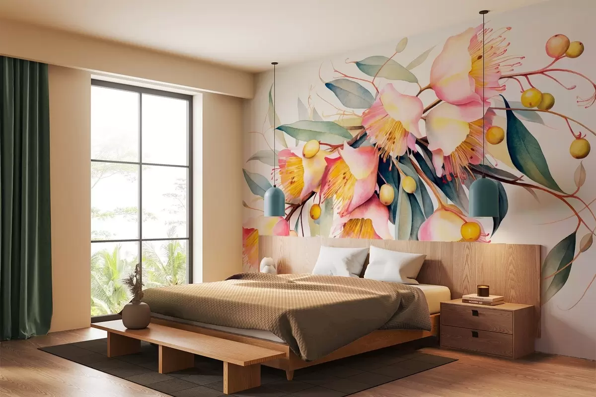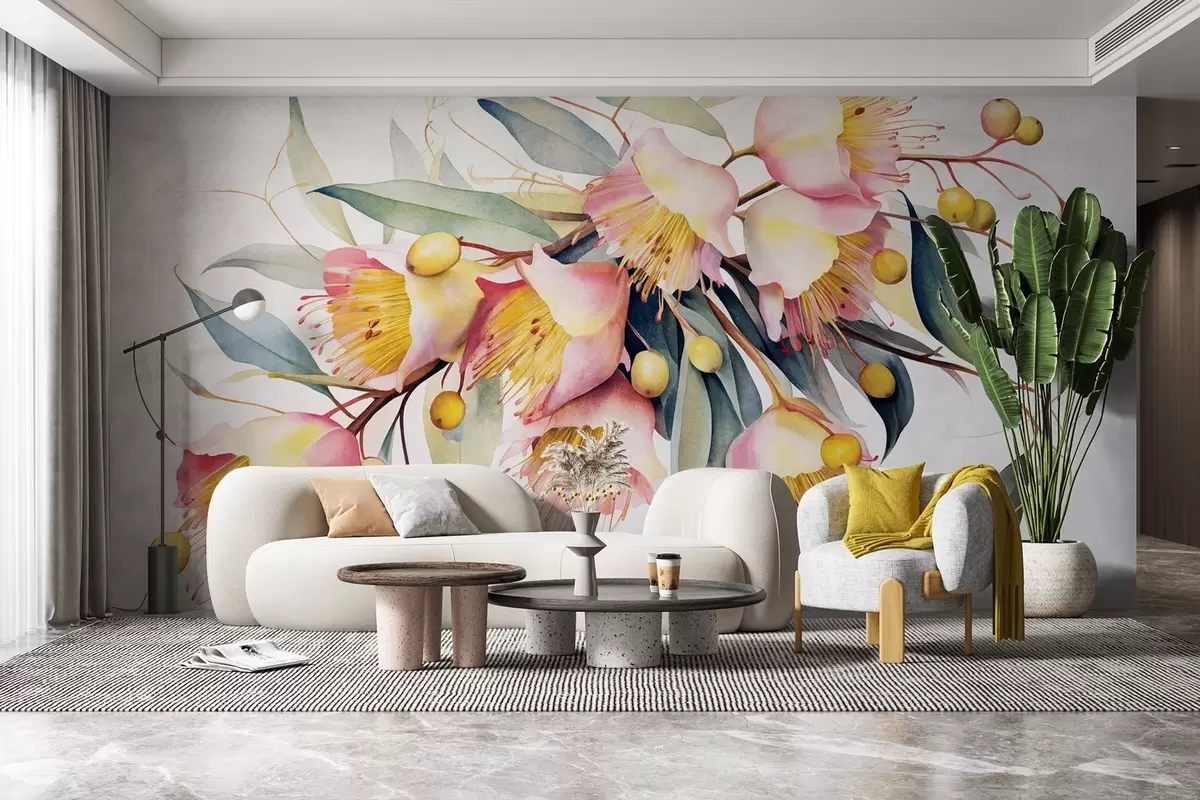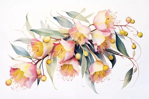 Fototapetes Eikalipta ziedi ar zaļām lapām, akvareļa stilā, mīksts un fakturēts, viegls fons, botānisks ziedu dizains Nr. w09202