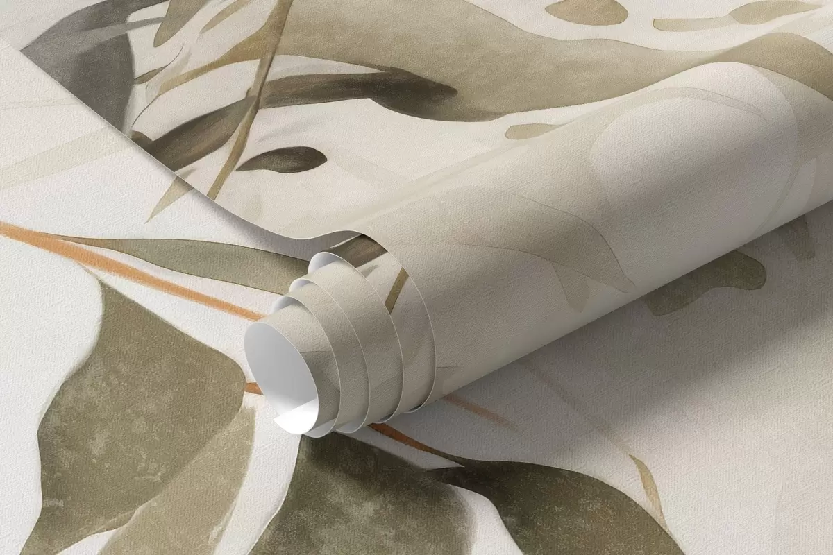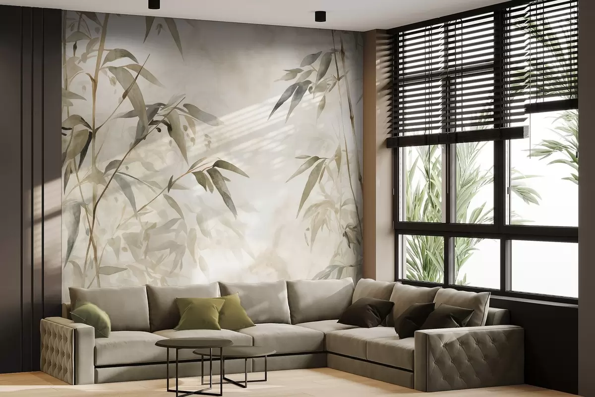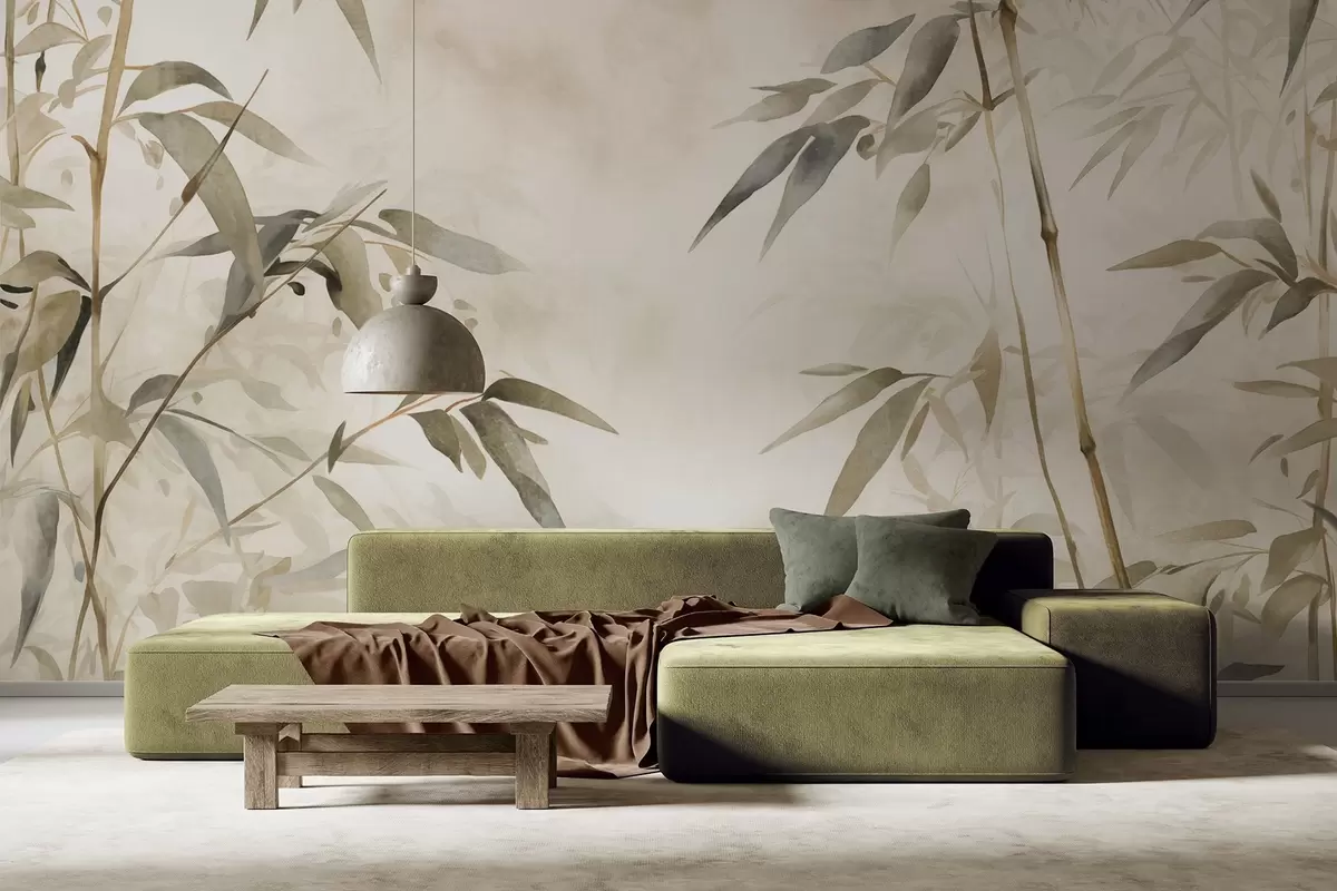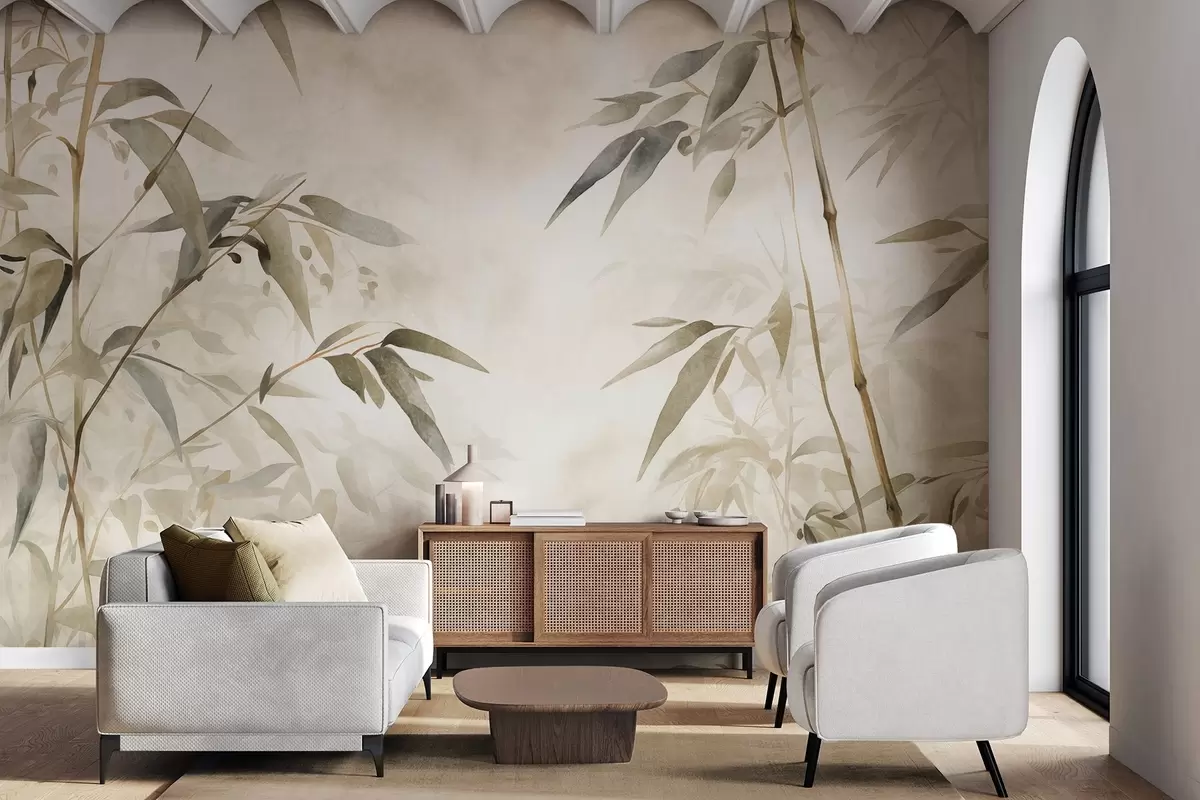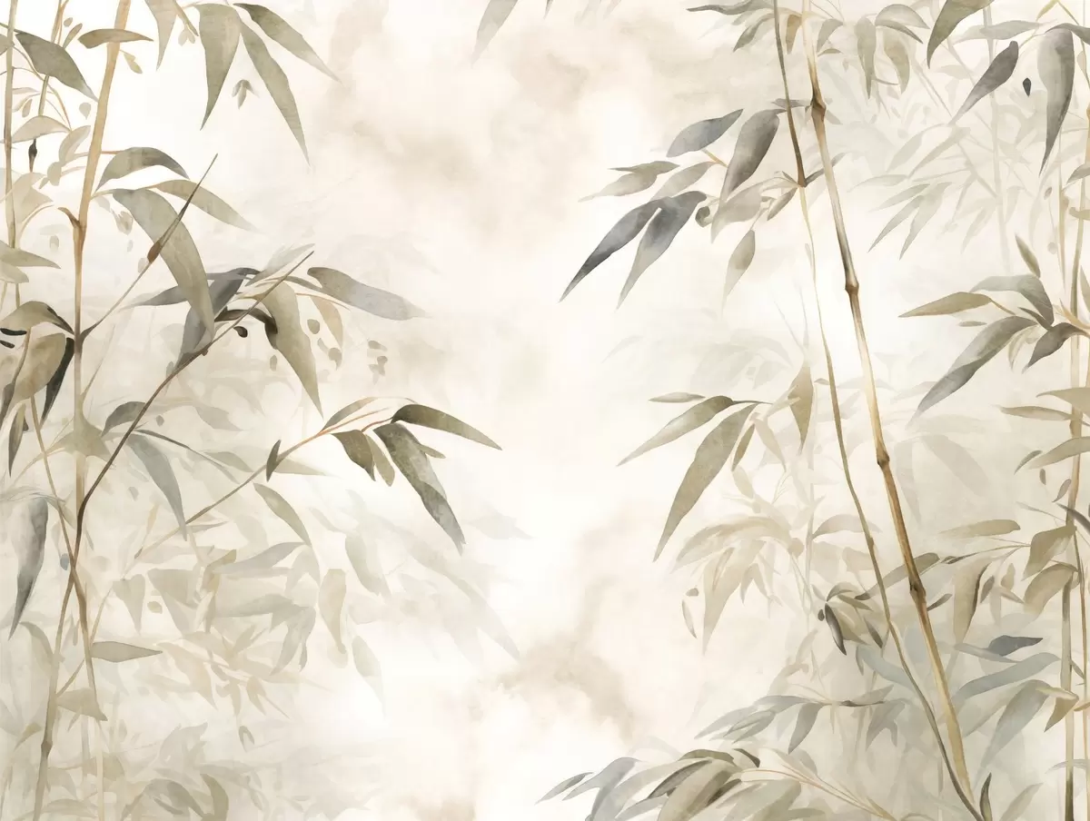 Fototapetes Bambusa tekstūras zari ar lapām akvareļu stilā, maiga, neitrāla krāsu palete, gaiši bēšs fons Nr. w09204