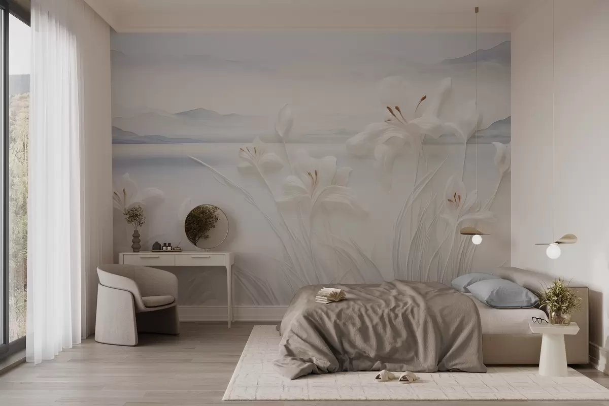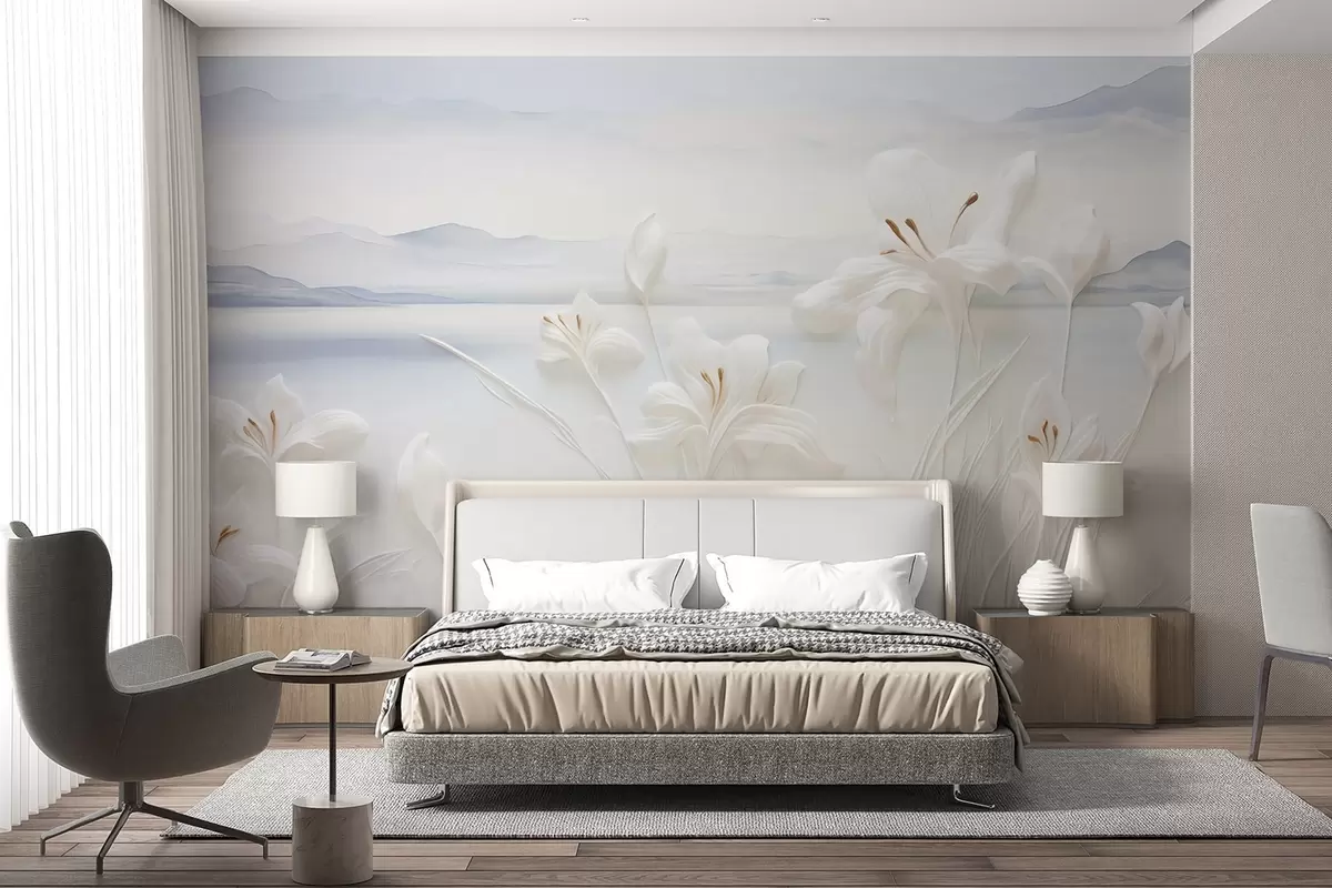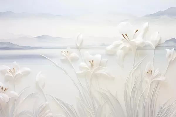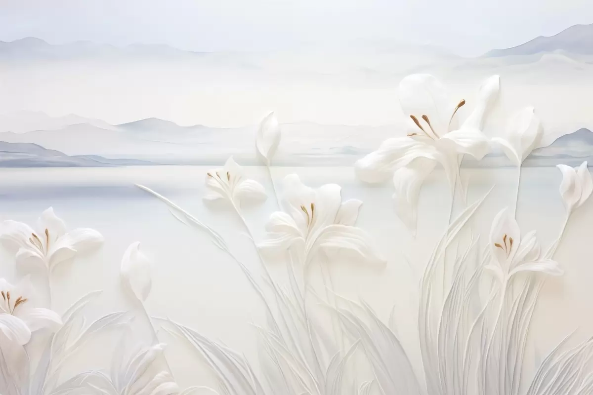 Fototapetes Baltas lilijas ar gariem kātiņiem un lapām, kalni un ezers fonā, minimālisma ainavas kompozīcija Nr. w09206