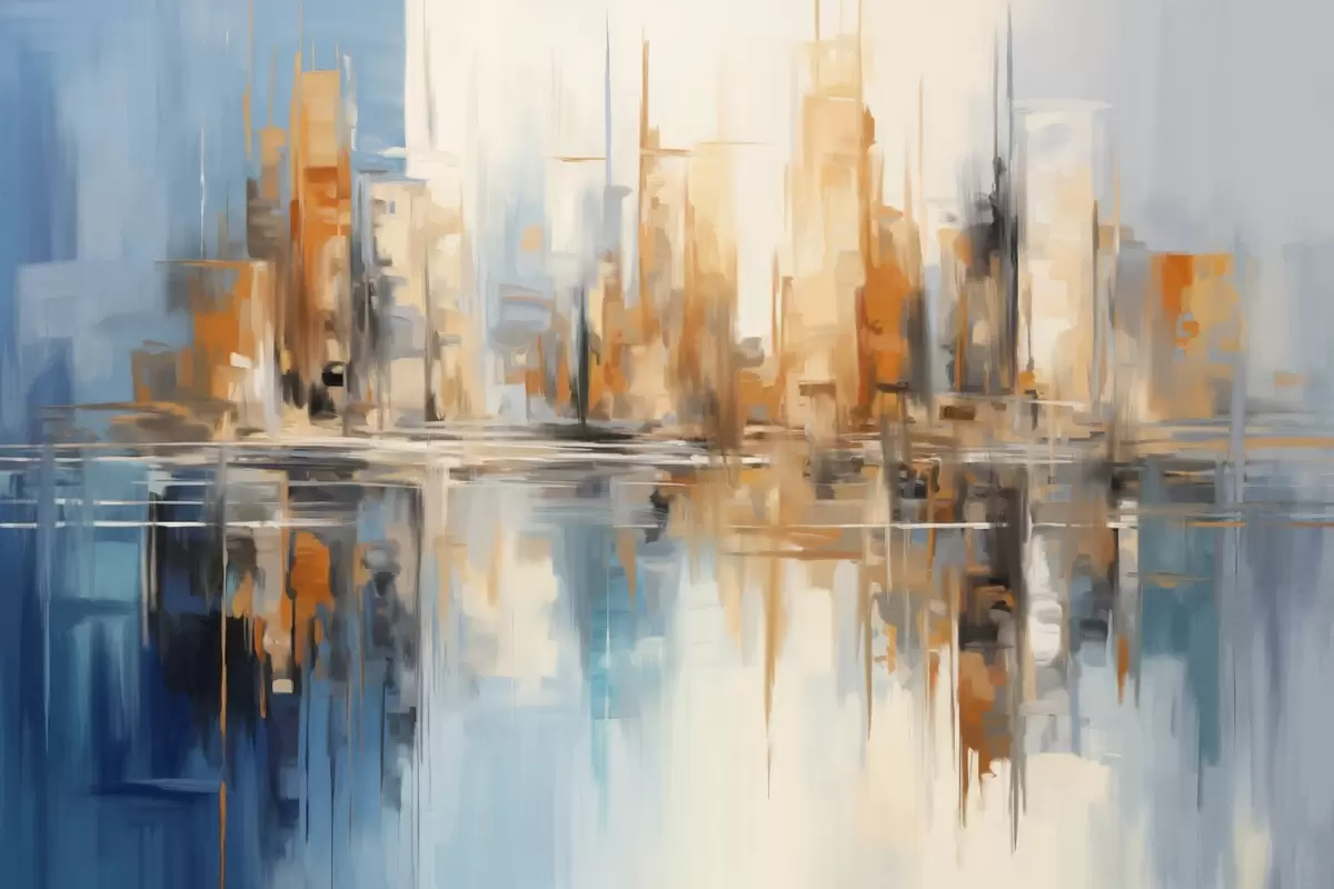 Fototapetes Abstrakta fakturēta pilsētas ainava ar augstām ēkām oranžā, zilā un baltā krāsā, kas atspoguļojas ūdenī Nr. w09207