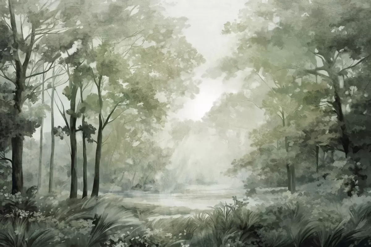 Fototapetes Teksturēta meža ainava, koki ar zaļām lapām, pasteļkrāsu palete Nr. w09210v2