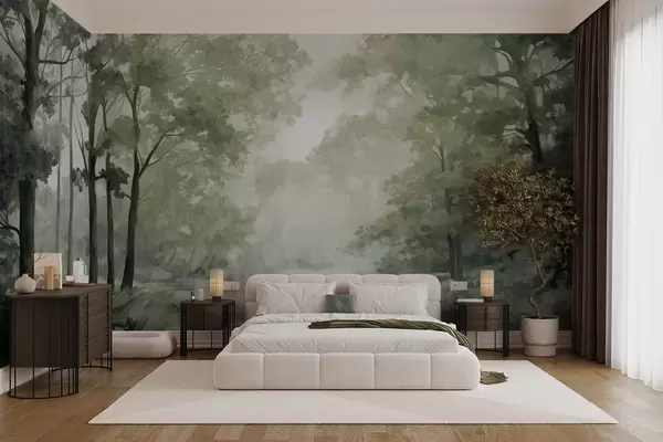 Fototapetes Teksturēta meža ainava, koki ar zaļām lapām, pasteļkrāsu palete Nr. w09210v2