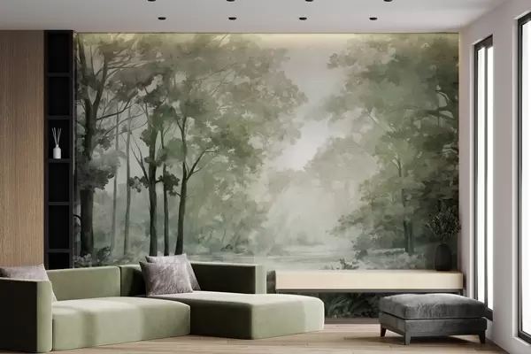 Fototapetes Teksturēta meža ainava, koki ar zaļām lapām, pasteļkrāsu palete Nr. w09210v2