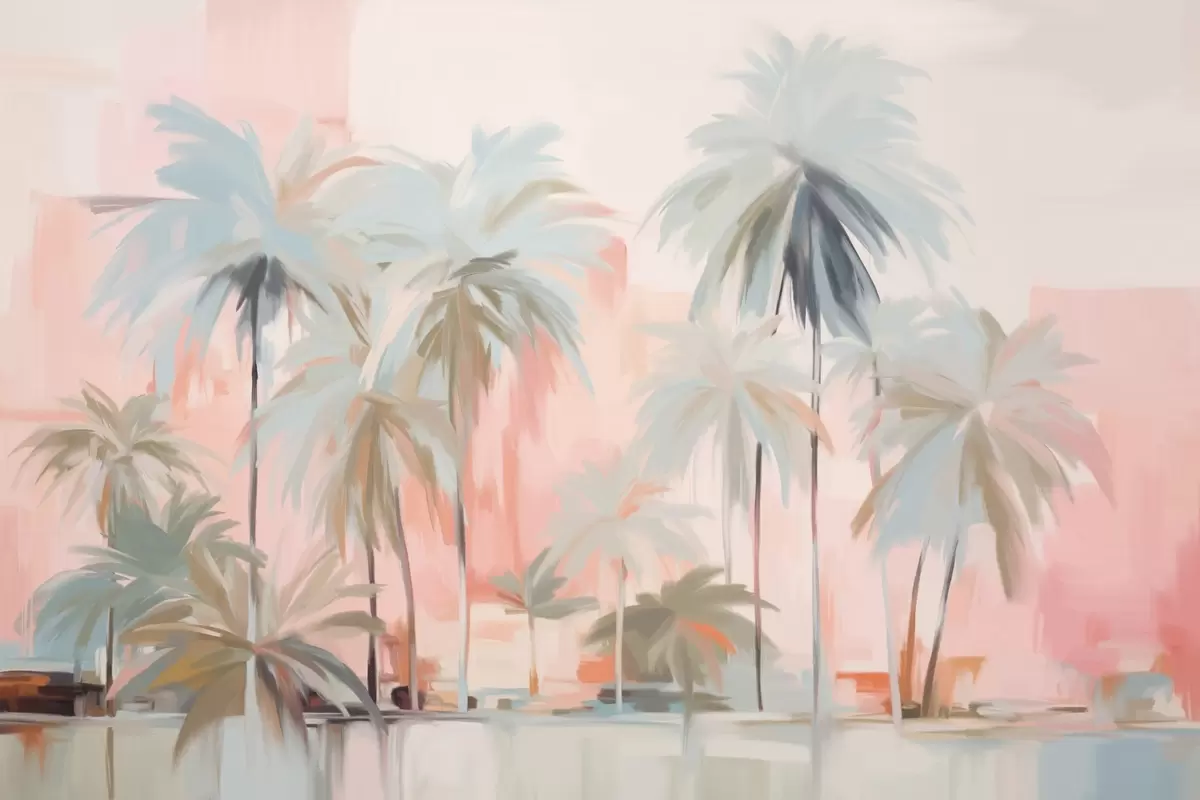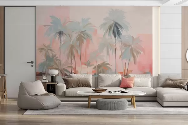 Fototapetes Abstraktas minimālistiskas pasteļkrāsas tropu palmas uz maigi rozā un persiku nokrāsu fona Nr. w09212