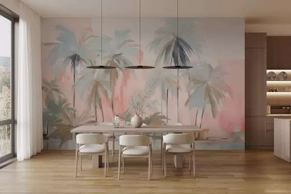 Fototapetes Abstraktas minimālistiskas pasteļkrāsas tropu palmas uz maigi rozā un persiku nokrāsu fona Nr. w09212