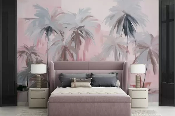 Fototapetes Abstraktas minimālistiskas pasteļkrāsas tropu palmas uz fona, kas ieturēts rozā un pelēkos toņos Nr. w09212v1