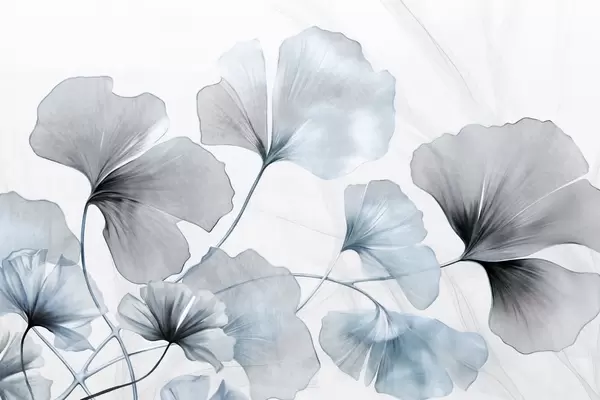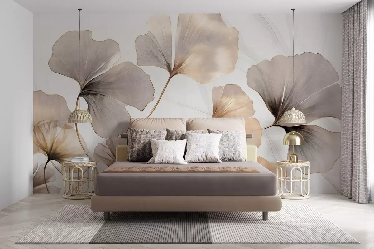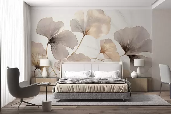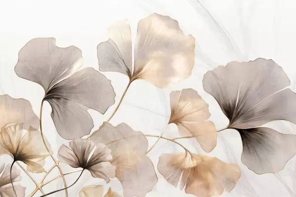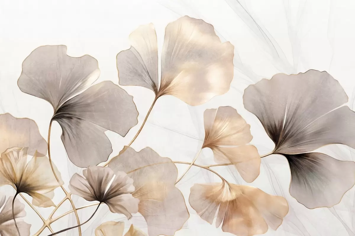 Fototapetes Ginkgo biloba lapas smilškrāsas, dzeltenos un brūnos toņos, smalks tekstūras akvareļa efekts, gaišs fons Nr. w09215