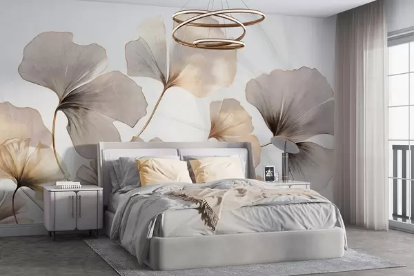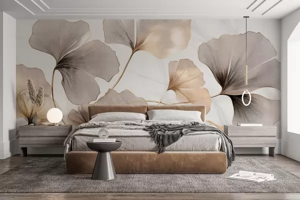 Fototapetes Ginkgo biloba lapas smilškrāsas, dzeltenos un brūnos toņos, smalks tekstūras akvareļa efekts, gaišs fons Nr. w09215