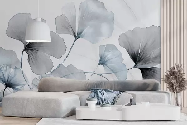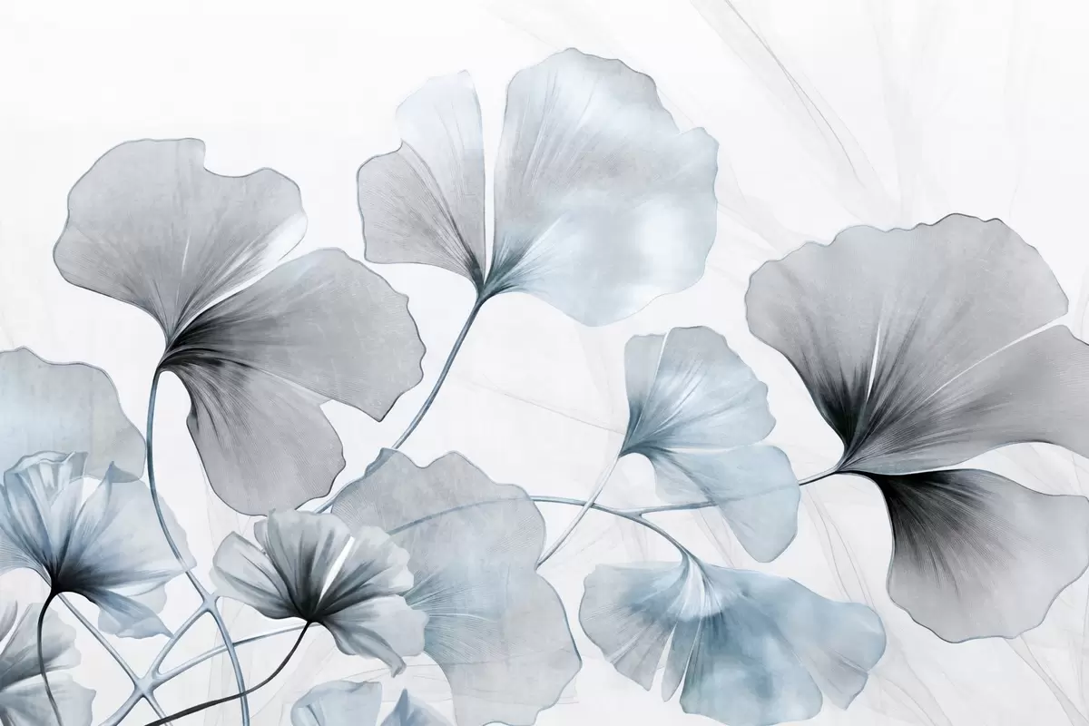 Fototapetes Ginkgo biloba lapas pieklusinātos zilos un pelēkos toņos, smalks tekstūras akvareļa efekts, gaišs fons Nr. w09215v1