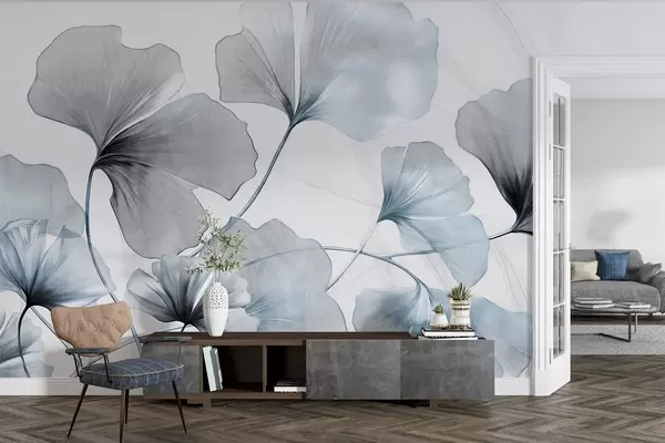 Fototapetes Ginkgo biloba lapas pieklusinātos zilos un pelēkos toņos, smalks tekstūras akvareļa efekts, gaišs fons Nr. w09215v1