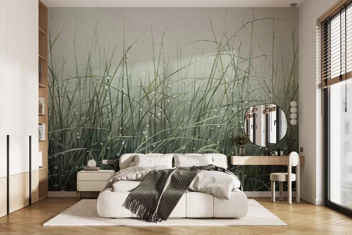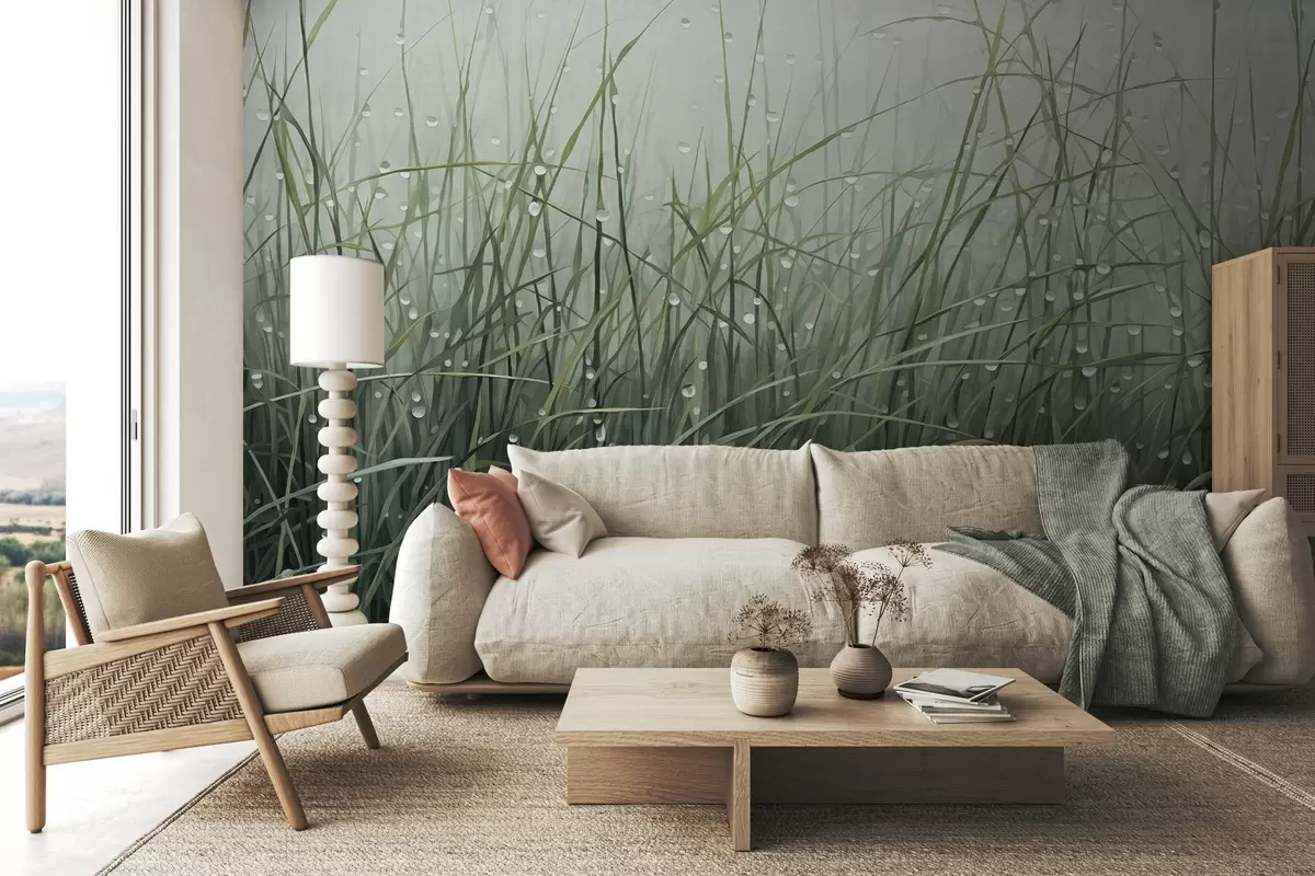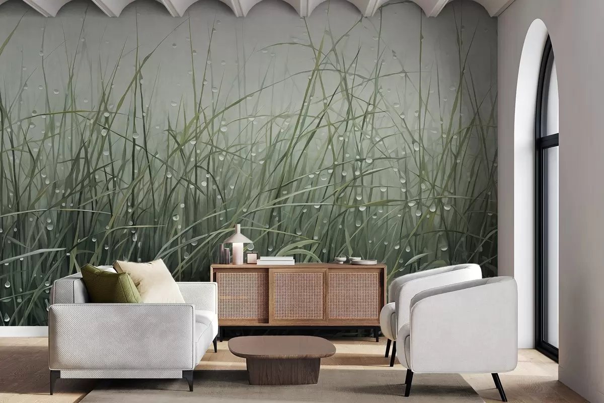Fototapetes Zāle ar ūdens pilieniem, pieklusināti zaļi toņi, maiga gaisma, miglains fons, abstrakts minimālisma stils ar faktūru Nr. w09217