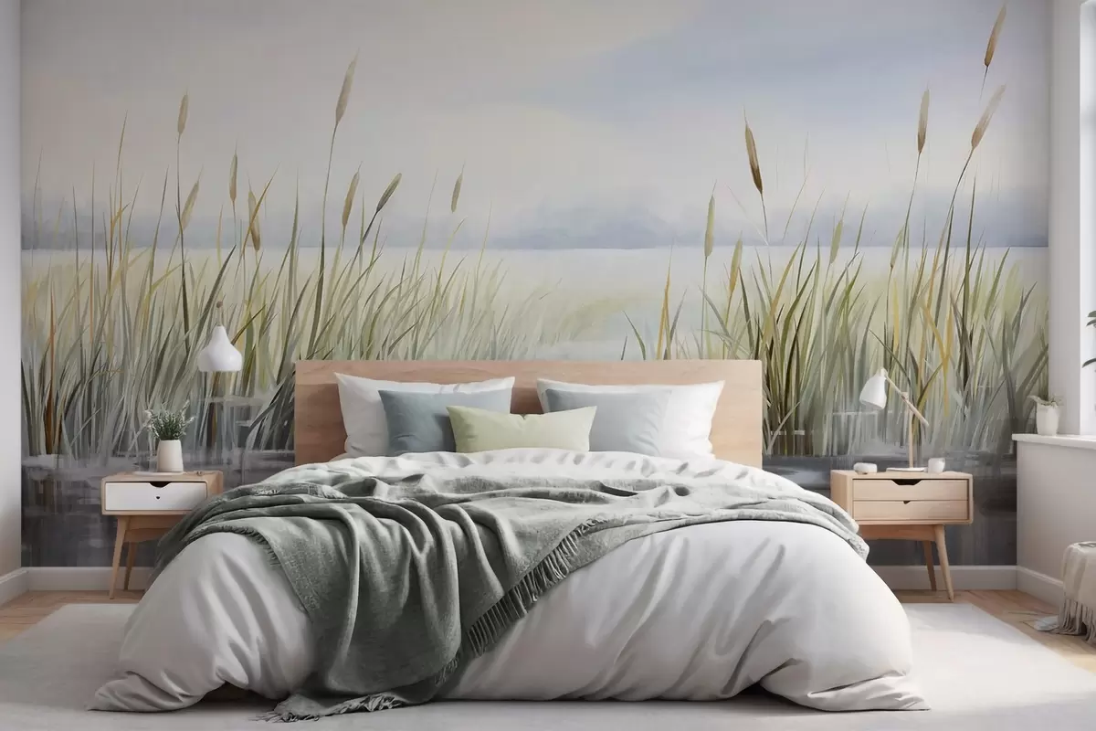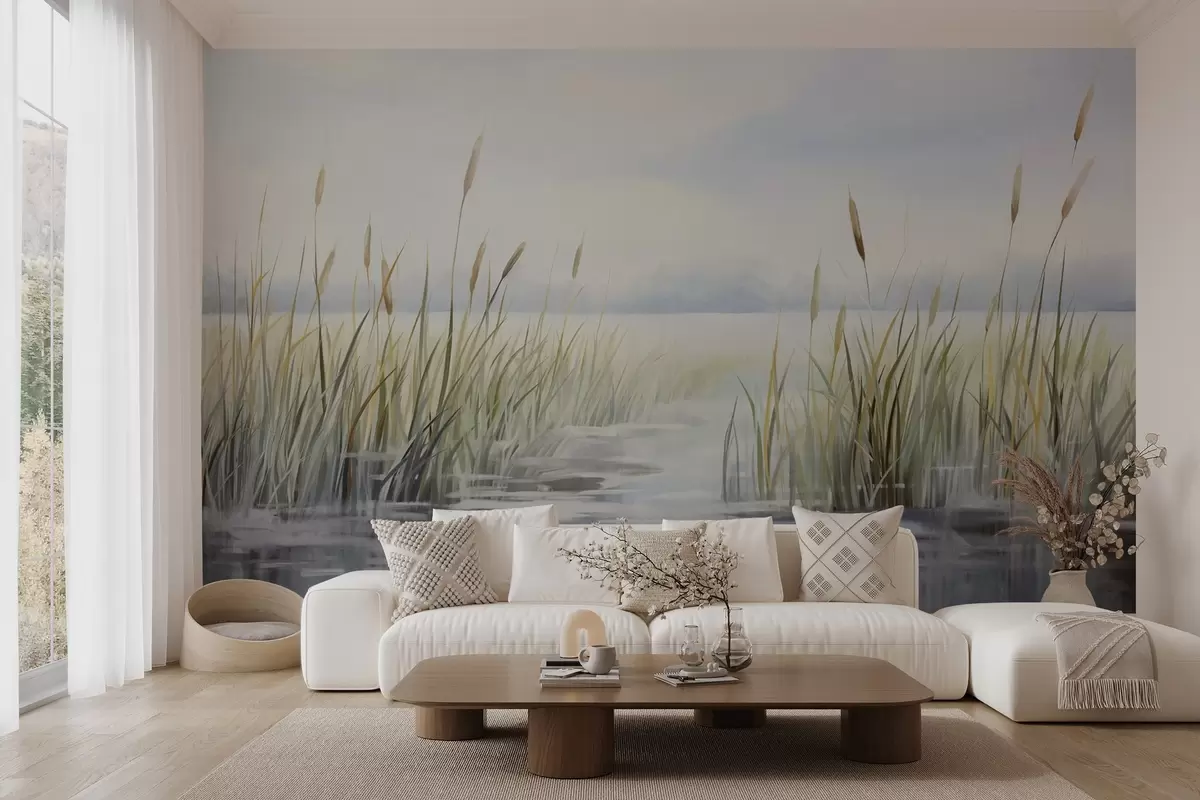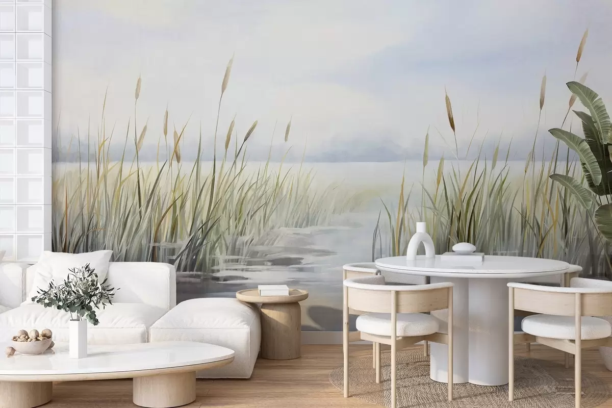 Fototapetes Akvareļa faktūras glezniecības imitācija ainavas ar ezeru, zāli, apmākušās debesis un izplūdušu fonu Nr. w09219