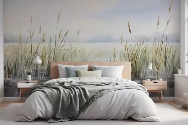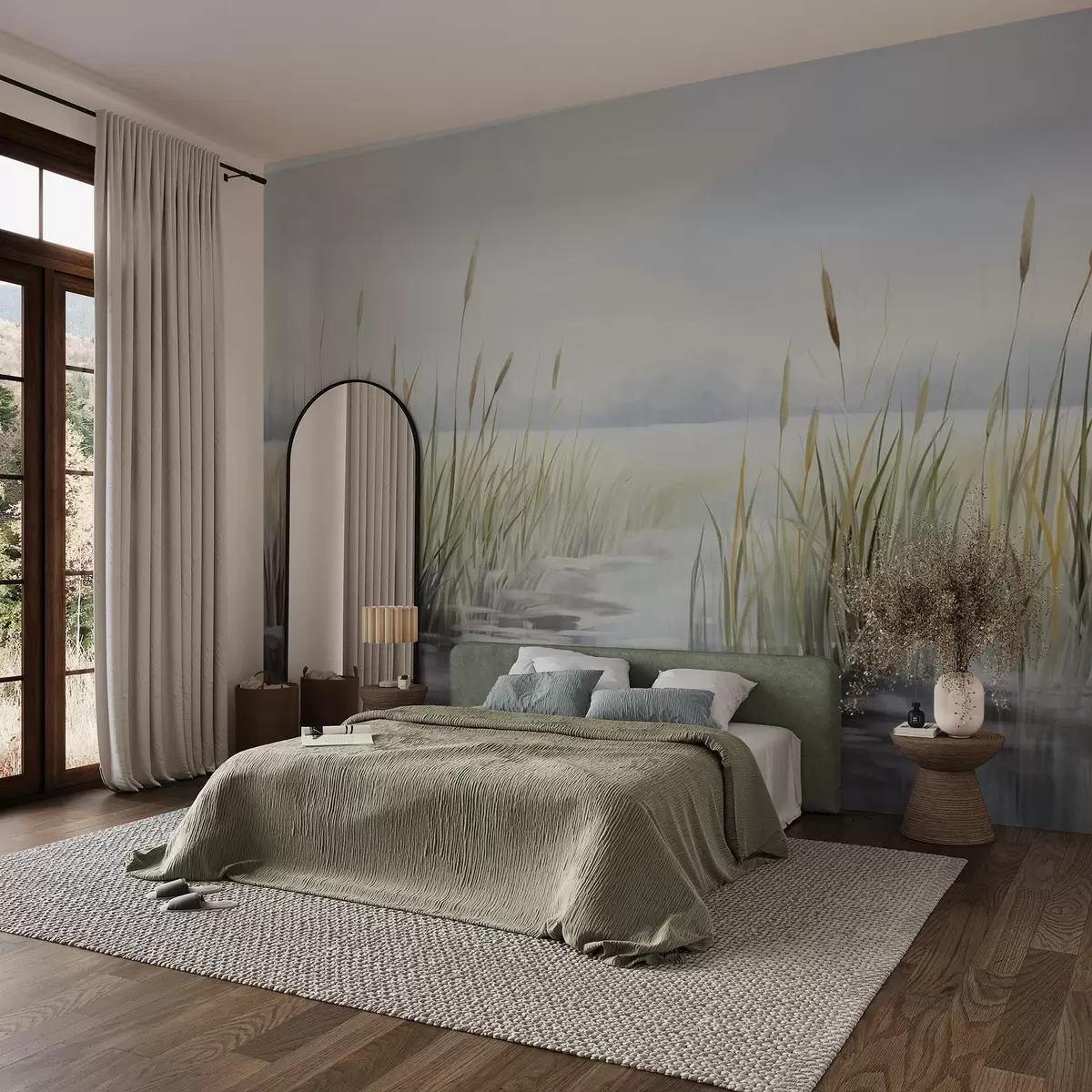 Fototapetes Akvareļa faktūras glezniecības imitācija ainavas ar ezeru, zāli, apmākušās debesis un izplūdušu fonu Nr. w09219