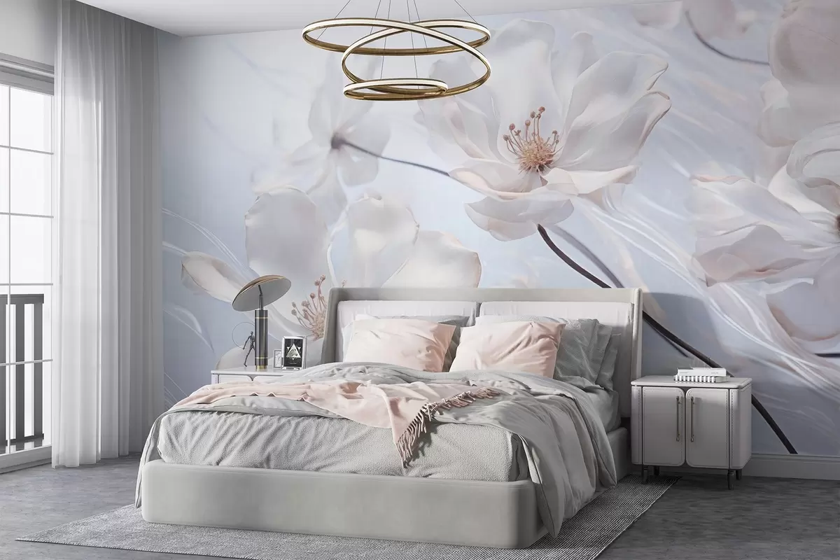 Fototapetes Balti tekstūras caurspīdīgi ziedi ar maigiem ziedlapiņām, maigs gaiši zils fons, elegants, romantisks, sapņains Nr. w09233