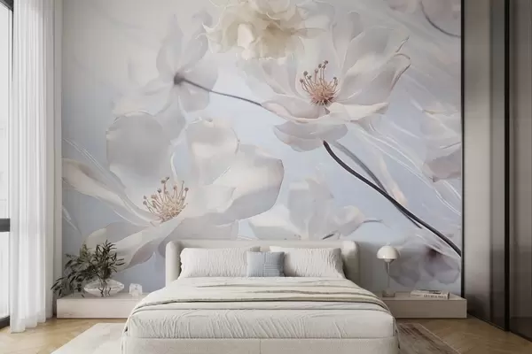 Fototapetes Balti tekstūras caurspīdīgi ziedi ar maigiem ziedlapiņām, maigs gaiši zils fons, elegants, romantisks, sapņains Nr. w09233