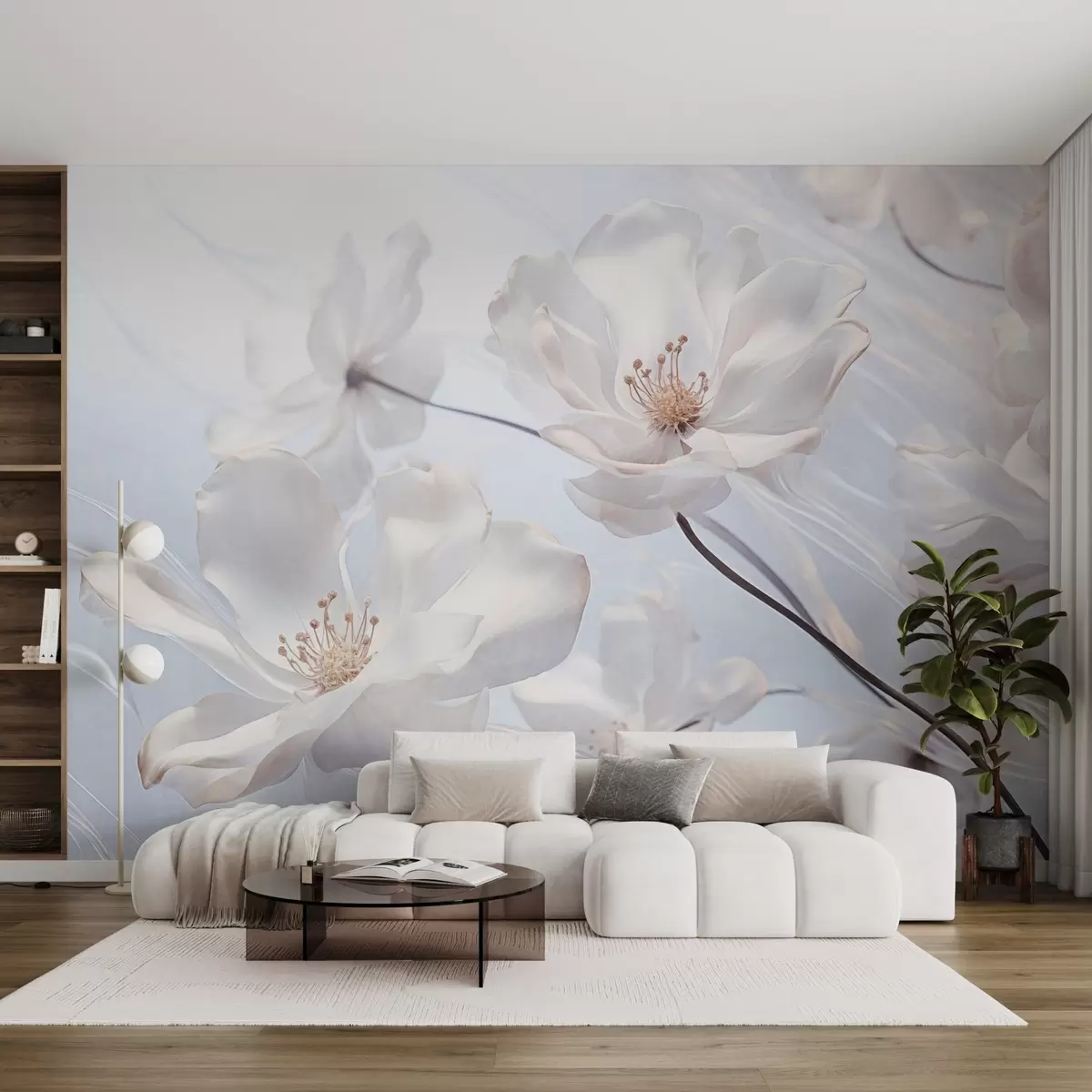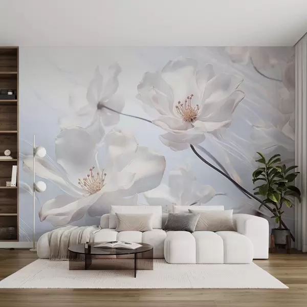 Fototapetes Balti tekstūras caurspīdīgi ziedi ar maigiem ziedlapiņām, maigs gaiši zils fons, elegants, romantisks, sapņains Nr. w09233