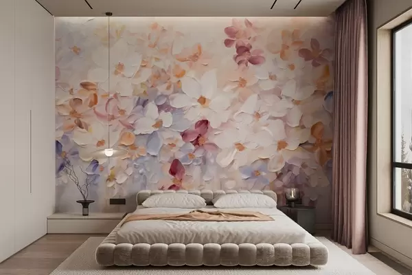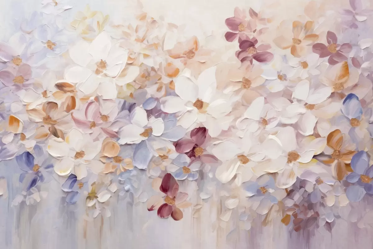 Fototapetes Eļļas glezniecības imitācija ziedu dārza ar baltiem, rozā un oranžiem ziediem, maigi triepieni ar otu, pasteļkrāsas, piesātinātas krāsas Nr. w09236