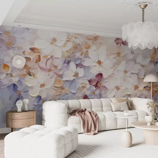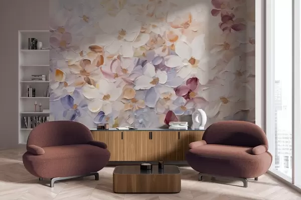 Fototapetes Eļļas glezniecības imitācija ziedu dārza ar baltiem, rozā un oranžiem ziediem, maigi triepieni ar otu, pasteļkrāsas, piesātinātas krāsas Nr. w09236