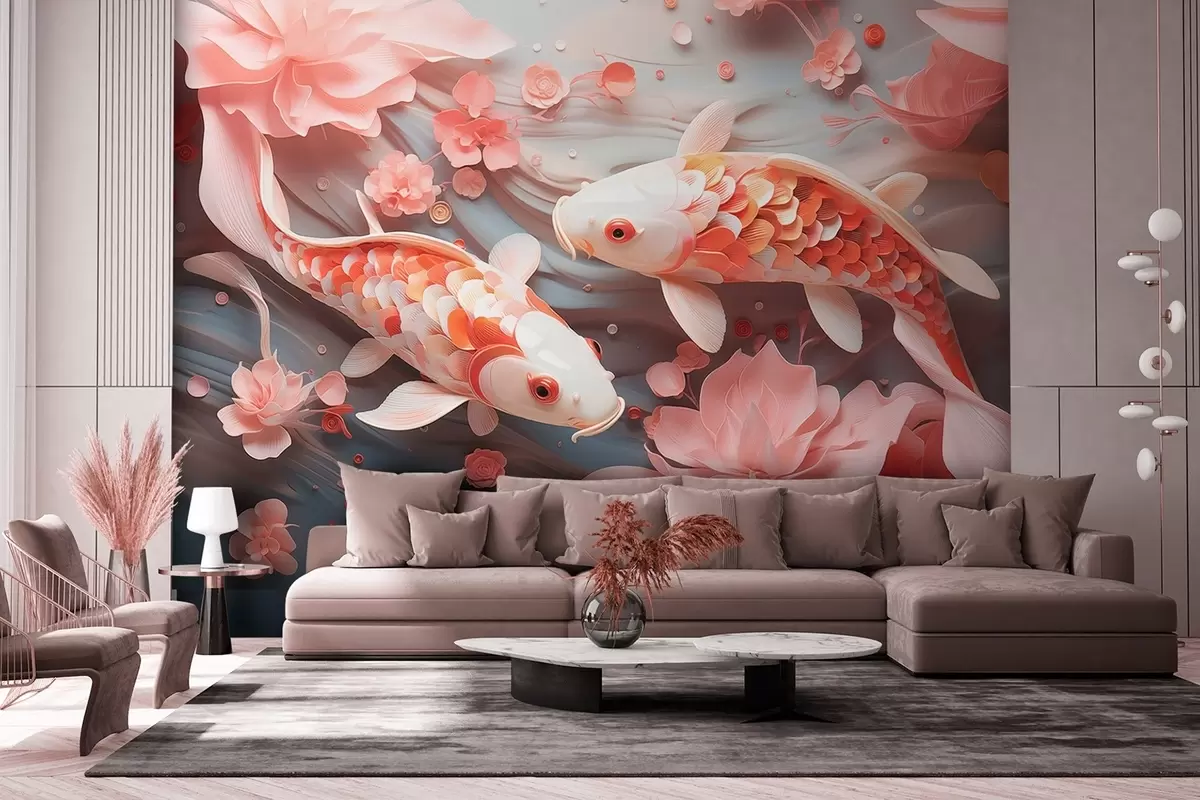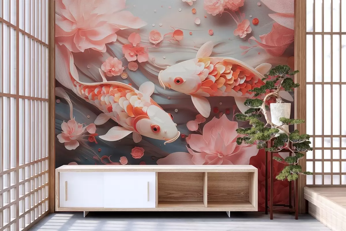 Fototapetes Delikātas zivtiņas ar dimensiju zvīņām peld cauri ziedlapiņu plūsmai un maigiem rozā toņiem Nr. w09237