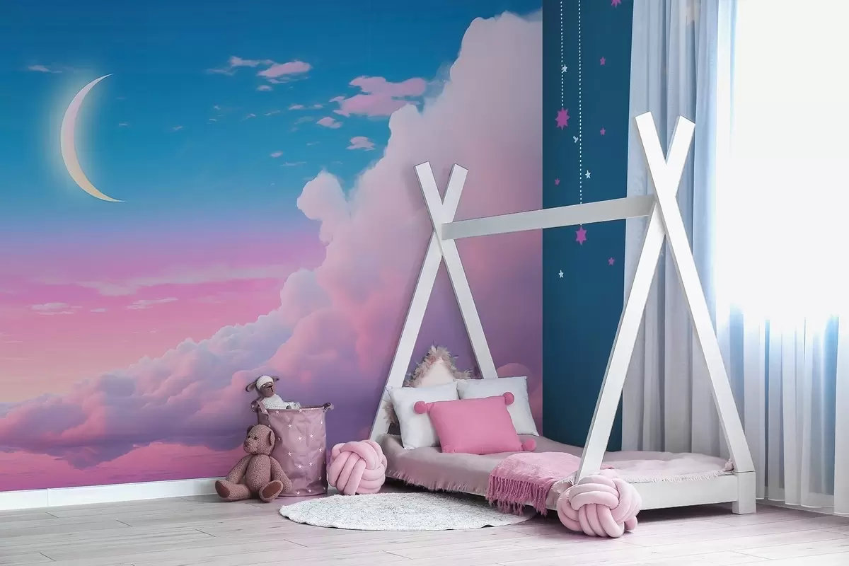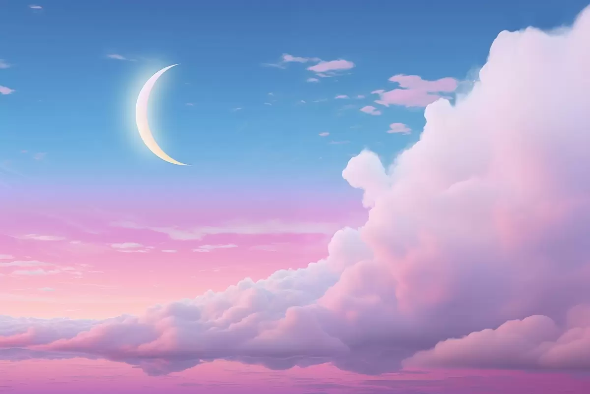 Fototapetes Maģisks saulriets ar mākoņiem un pusmēness rozā un zilos toņos Nr. w09240