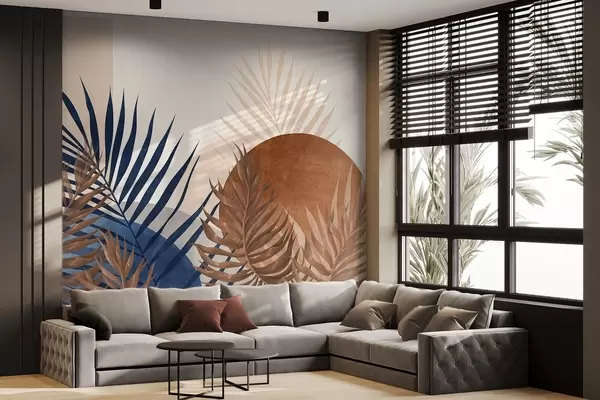 Fototapetes Abstrakta fakturēta kompozīcija ar tropu lapām zilos un zemes toņos, ar lielu apļveida formu Nr. w09257