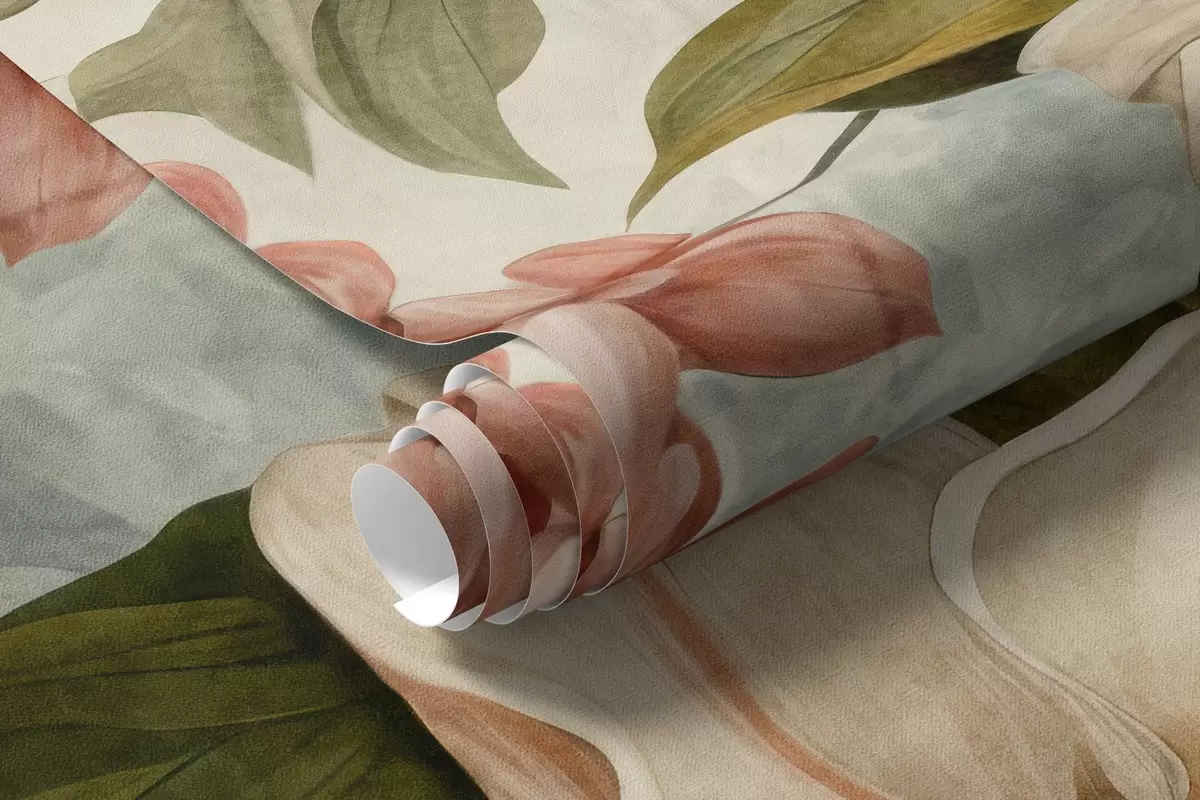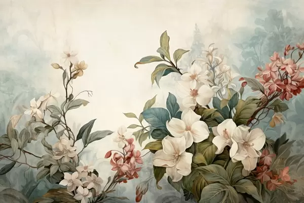 Fototapetes Teksturēti tropu ziedi un lapas ar maigi ziliem un zaļiem toņiem, maigi otas triepieni, vintage botāniskais stils Nr. w09259