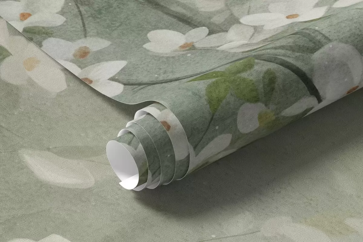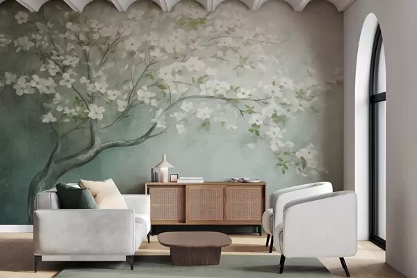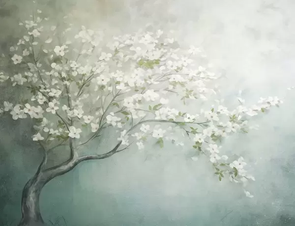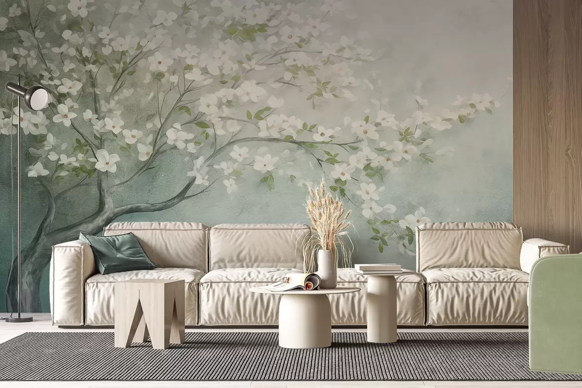 Fototapetes Ziedošs koks ar baltiem ziediem pilnā ziedēšanas laikā uz graudaina, trokšņaina, trokšņainas faktūras fona, kurā ir izslēgta zila un zaļa krāsa Nr. w09261