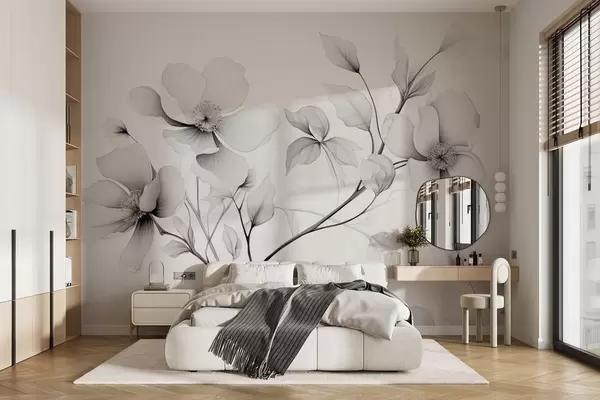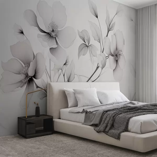 Fototapetes Melni un balti ziedi ar elegantām līnijām uz pelēka fona Nr. w09271