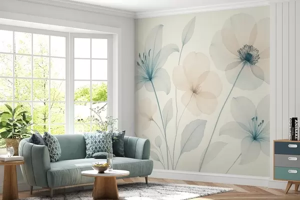Fototapetes Maigi ziedi pasteļzilā un krēmkrāsas akvareļu stilā Nr. w09287