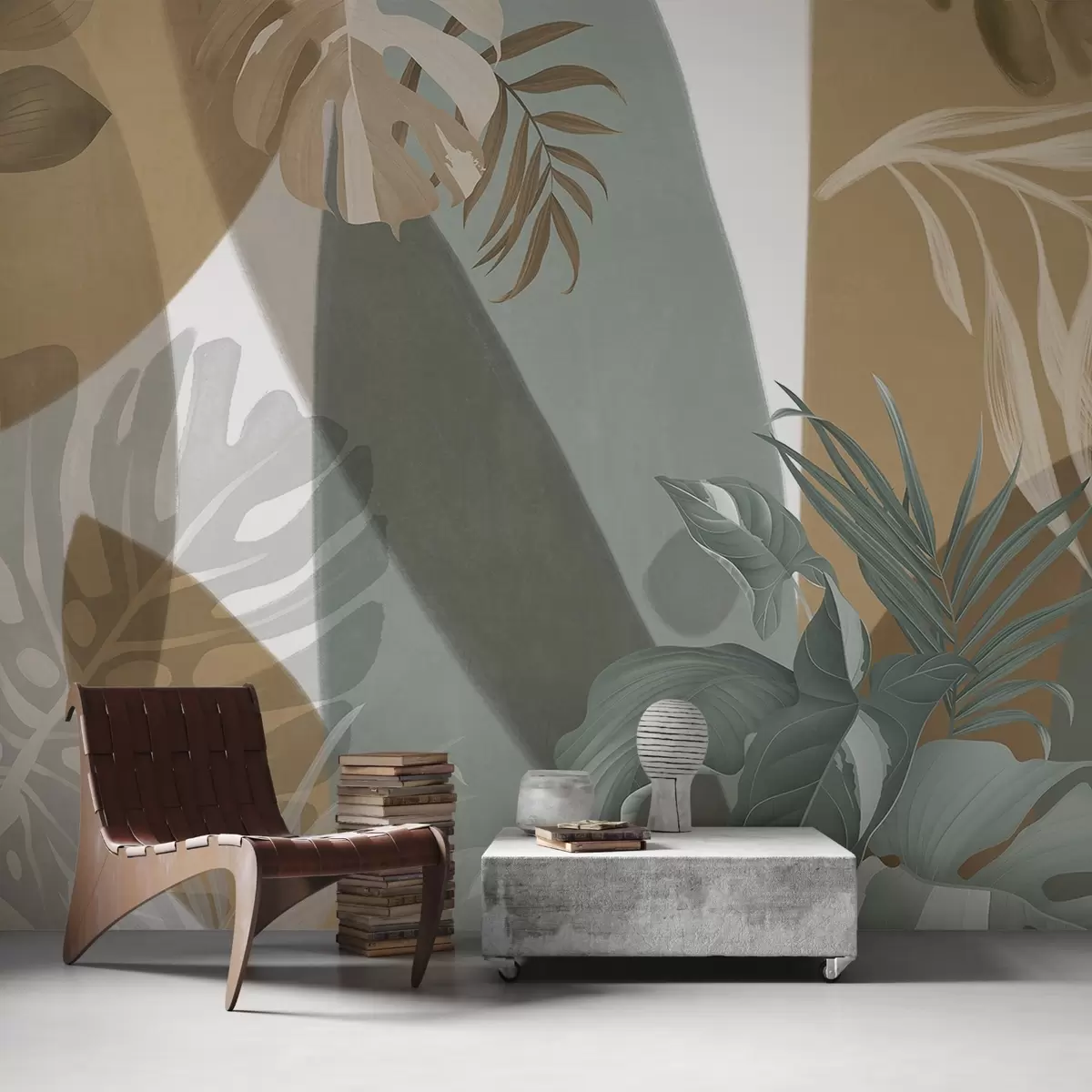 Fototapetes Monsteras lapas un palmu lapas ar brūnu, baltu un zaļu krāsu rakstu, tropu noskaņa, abstraktas formas, dekoratīvas w09288