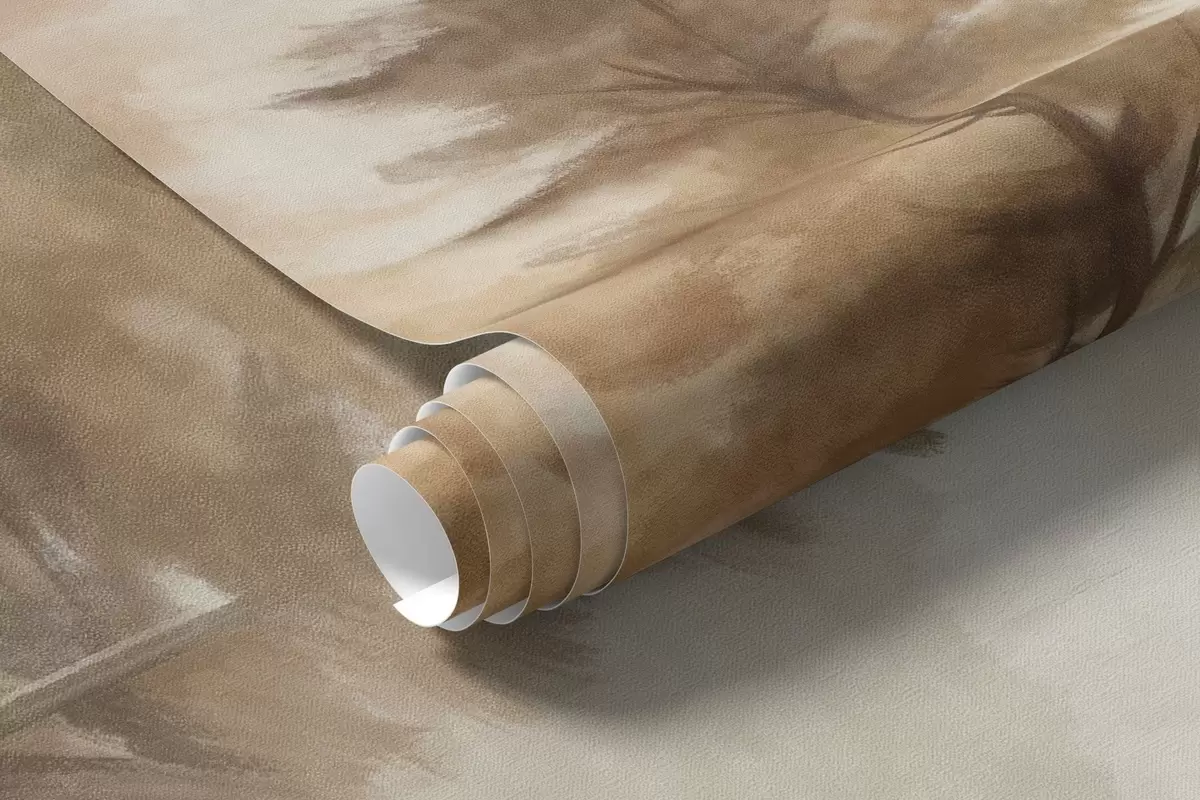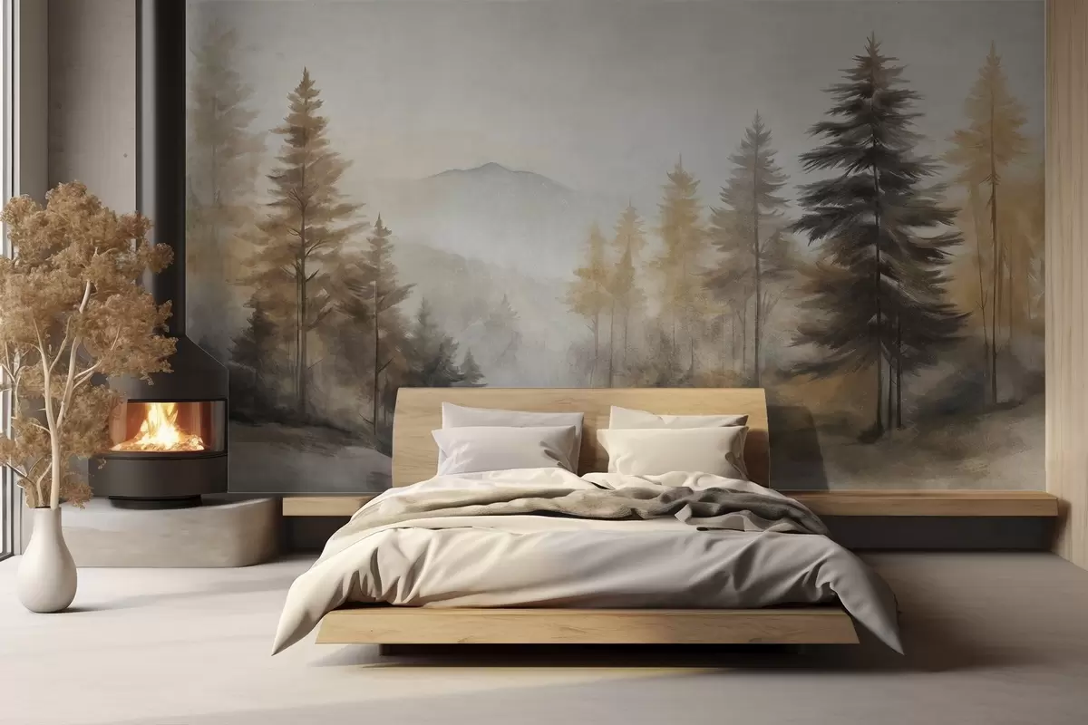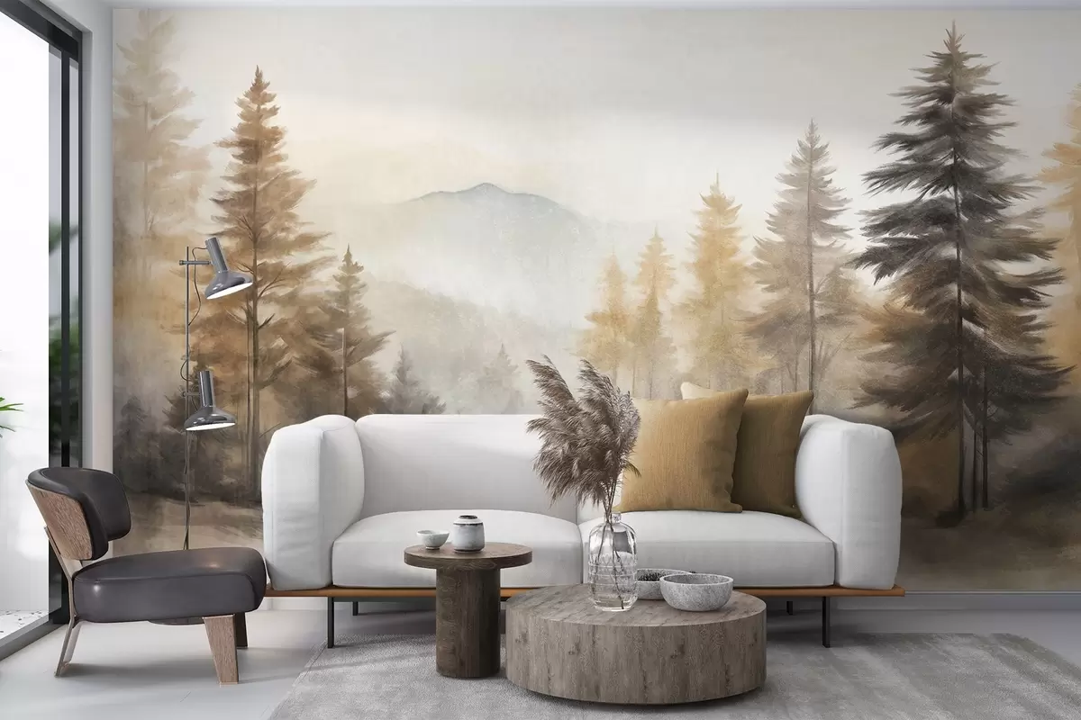 Fototapetes Textured rudens mežs ar augstām priedēm un kalniem fonā, krāsas ir pieklusinātas un zemes gleznošanas stilā Nr. w09290