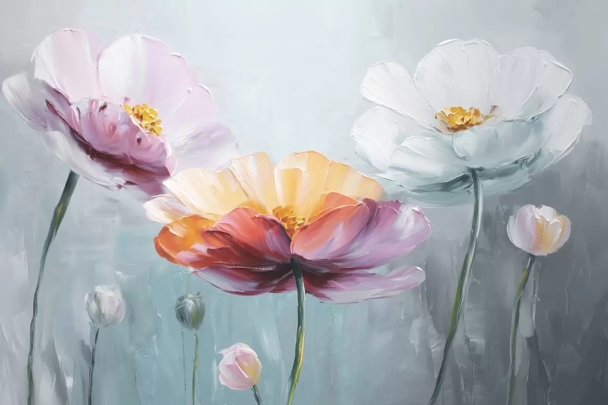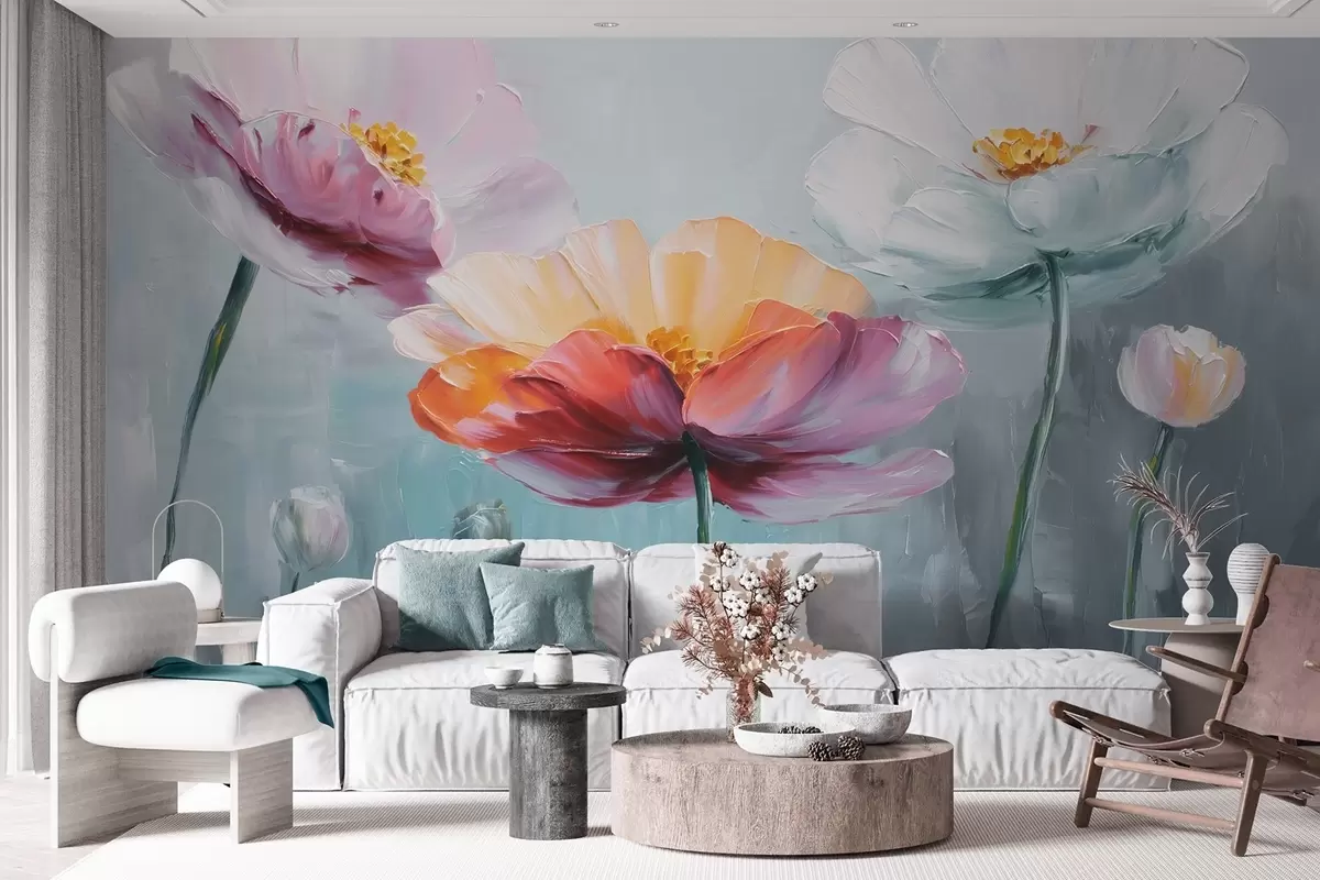 Fototapetes Spilgtas puķes eļļas gleznošanas tehnikā uz zila fona Nr. w09310