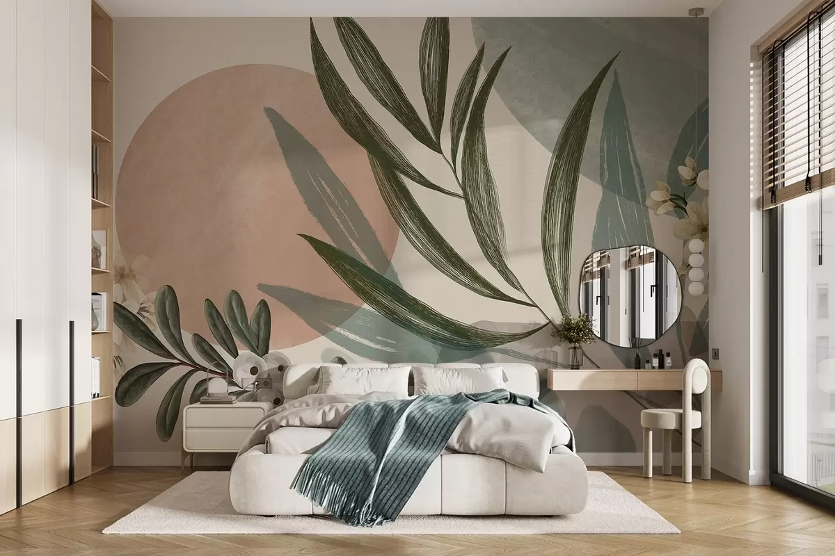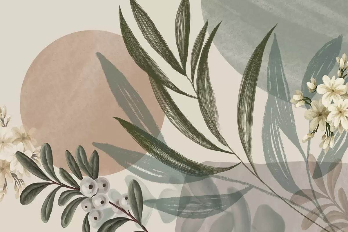 Fototapetes Abstraktā botāniskā māksla ar zaļām palmu lapām un baltām ogām uz fona, kas veidots no formām pieklusinātos zemes toņos Nr. w09312