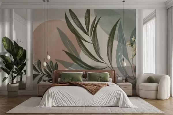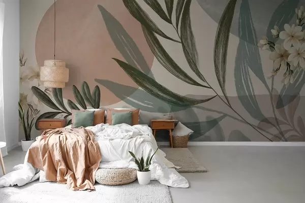 Fototapetes Abstraktā botāniskā māksla ar zaļām palmu lapām un baltām ogām uz fona, kas veidots no formām pieklusinātos zemes toņos Nr. w09312