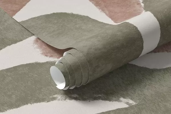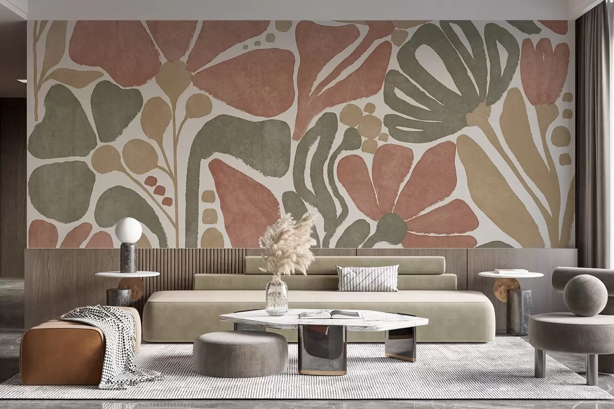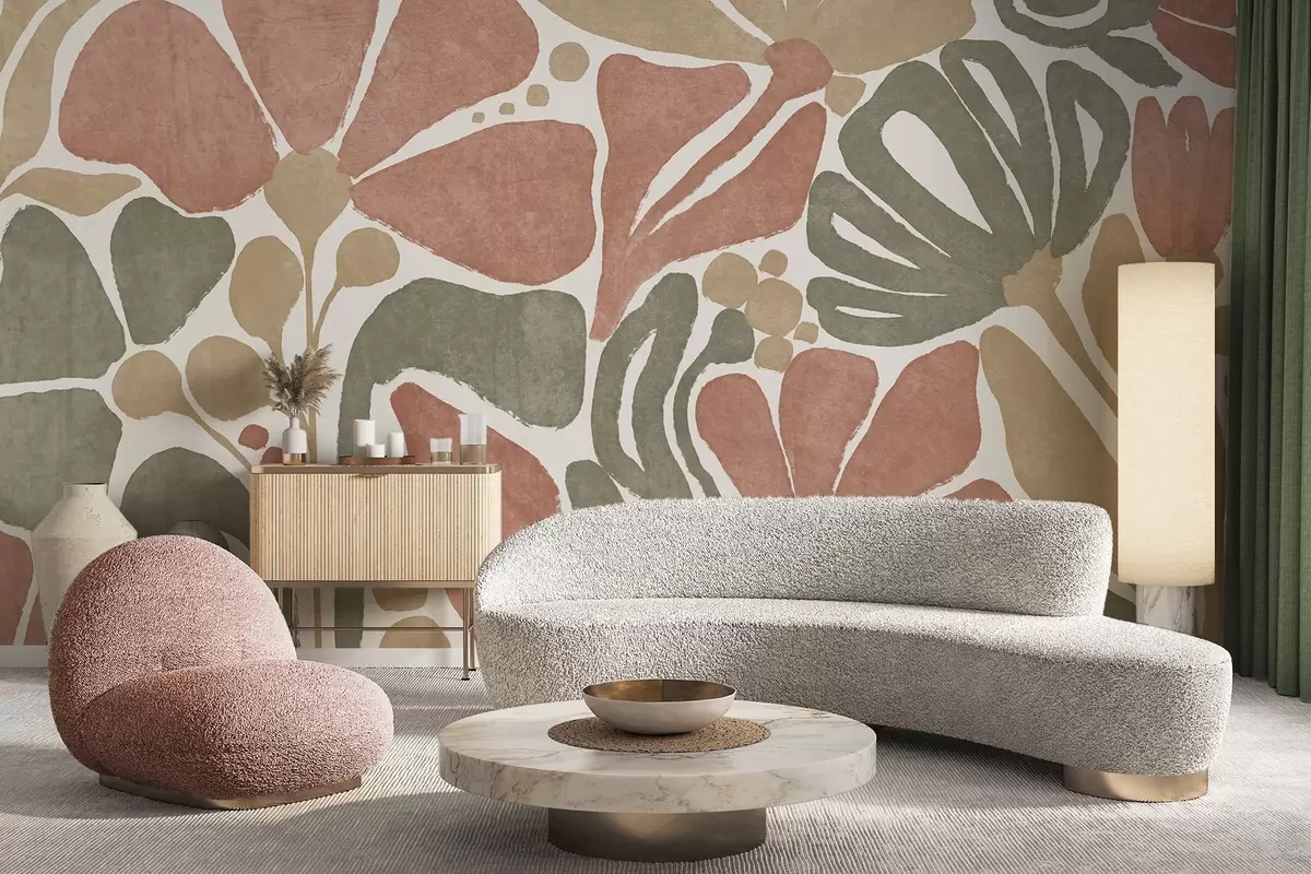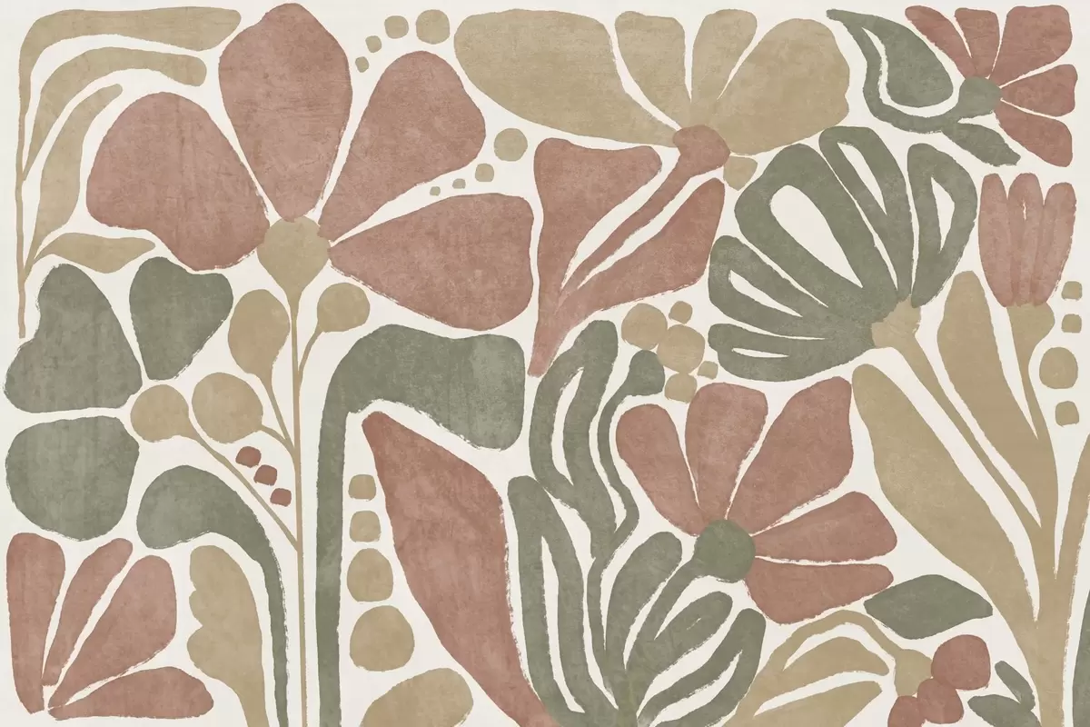 Fototapetes Abstrakti ziedi sarkanos, zaļos un bēšos toņos, uz gaiša fona, plakanā, stilizētā, modernā, minimālisma stilā Nr. w09315