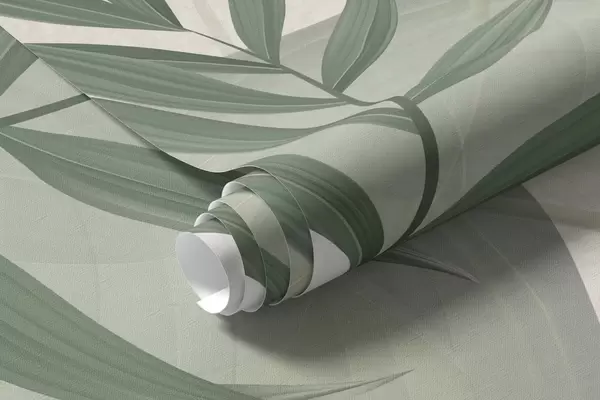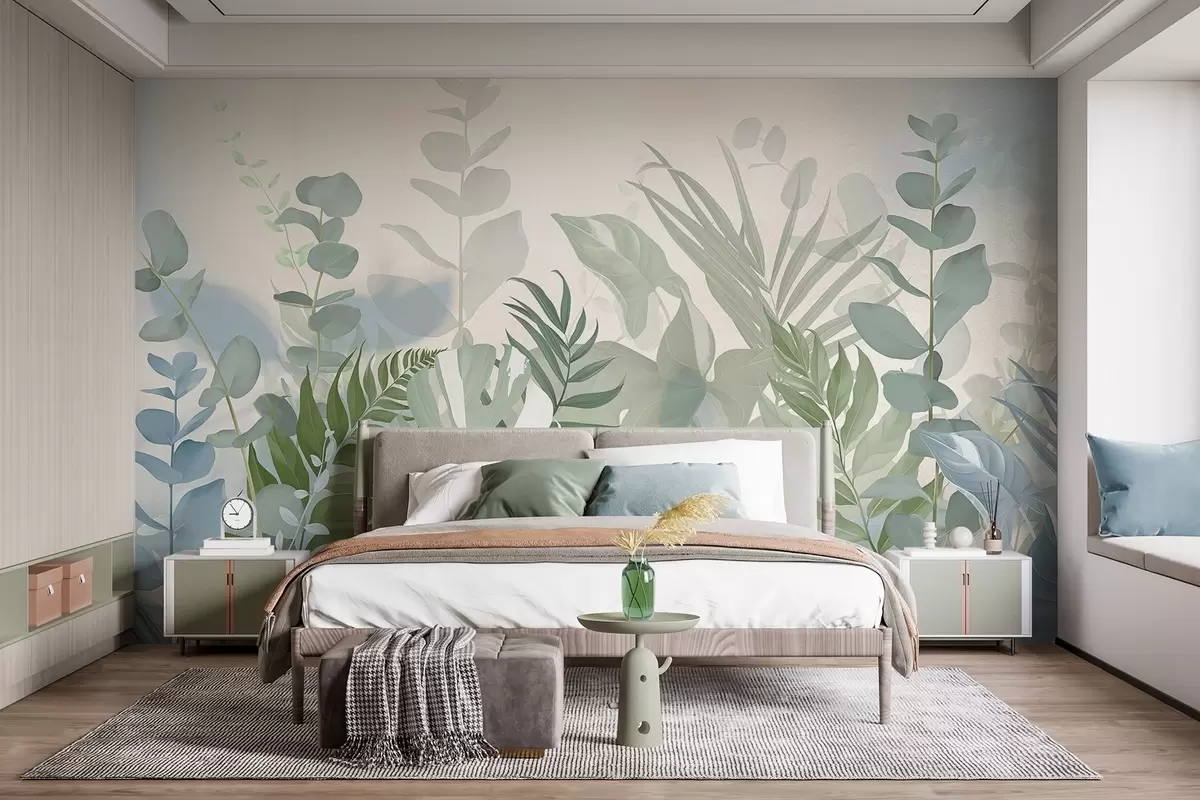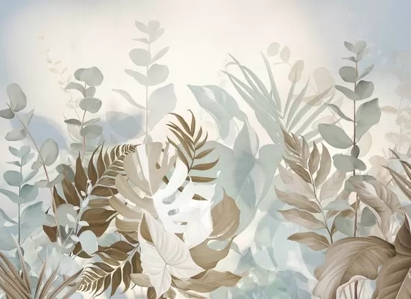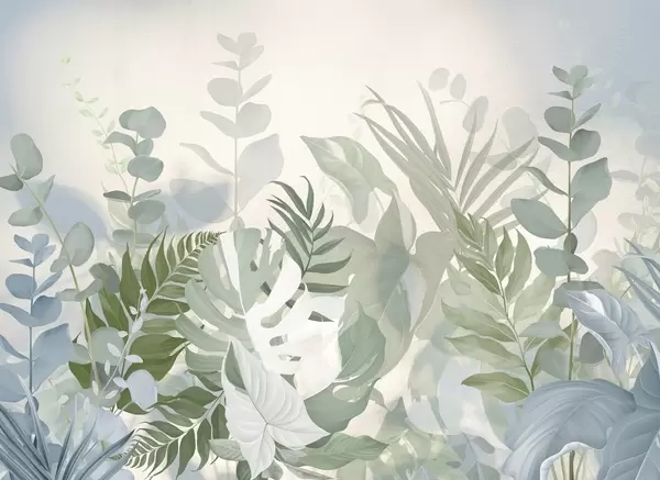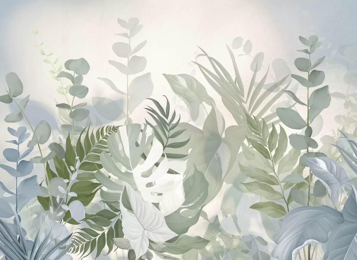 Fototapetes Pasteliski zaļi augi papardes, monstera un eikalipts, viegls teksturēts fons, mīksts apgaismojums, mierīgs , botāniska ilustrācija Nr. w09316