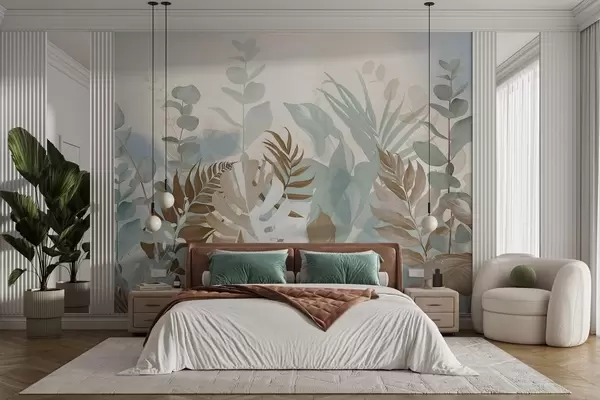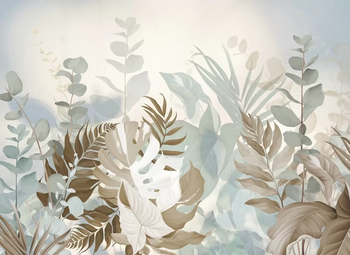 Fototapetes Pastelis augu papardes, monstera un eikalipts, gaismas teksturēts fons, mīksts apgaismojums, mierīgs , botāniska ilustrācija Nr. w09316v1